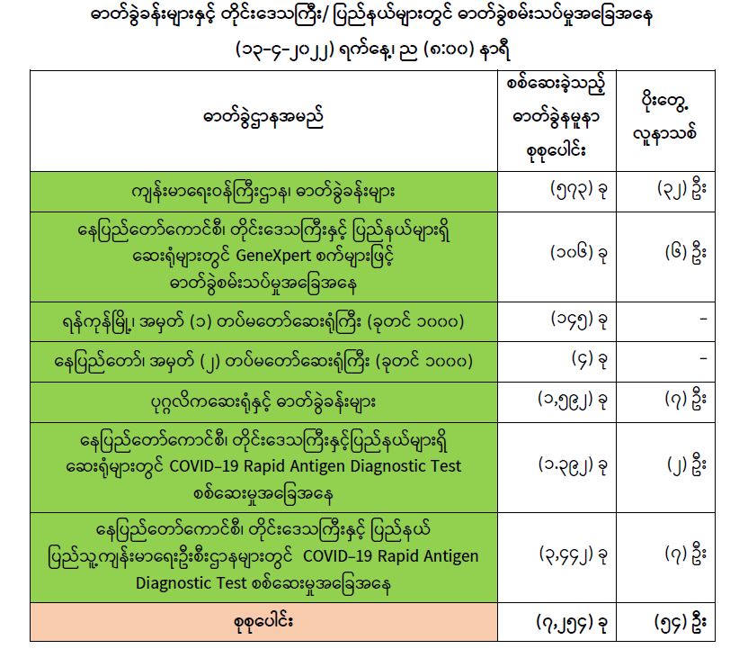 သို့ဖြစ်ပါ၍ ယနေ့အထိ ဓာတ်ခွဲနမူနာစုစုပေါင်း (၇,၈၀၅,၆၈၈) ခုအား စစ်ဆေးခဲ့ပြီး COVID-19 ဓာတ်ခွဲအတည်ပြုလူနာ စုစုပေါင်း (၆၁၂,၄၆၀) ဦး ရှိပြီဖြစ်ပါသည်။