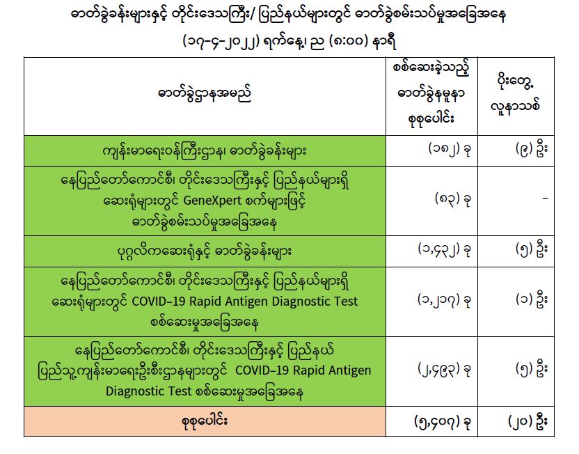 သို့ဖြစ်ပါ၍ ယနေ့အထိဓာတ်ခွဲနမူနာစုစုပေါင်း (၇,၈၂၈,၅၁၀)ခုအား စစ်ဆေးခဲ့ပြီး COVID-19 ဓာတ်ခွဲအတည်ပြုလူနာ စုစုပေါင်း (၆၁၂,၅၆၅) ဦး ရှိပြီဖြစ်ပါသည်။