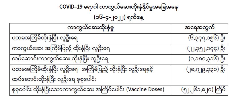 COVID-19 ရောဂါ ကာကွယ်ထိန်းချုပ်ရေးအတွက် တိုင်းဒေသကြီး/ပြည်နယ်များတွင် COVID-19 ရောဂါကာကွယ်ဆေးကို ဦးတည်အုပ်စုများသတ်မှတ်၍ ထိုးနှံပေးလျက်ရှိရာ (၁၆-၄-၂၀၂၂) ရက်နေ့ အထိ လူဦးရေ စုစုပေါင်း (၂၈,၇၂၉,၃၃၀) ဦးအား ထိုးနှံပေးပြီးဖြစ်၍ ပထမအကြိမ်ထိုးနှံပြီးစီးသူ (၆,၃၇၇,၁၅၆) ဦး၊ ကာကွယ်ဆေးအကြိမ်ပြည့် ထိုးနှံပြီးစီးသူ (၂၂,၃၅၂,၁၇၄) ဦးနှင့် ထပ်ဆောင်း ကာကွယ်ဆေး ထိုးနှံပြီးစီးသူ (၁,၁၈၀,၃၁၆) ဦး ရှိပြီဖြစ်ပါသည်။ သို့ဖြစ်ပါ၍ (၁၆-၄-၂၀၂၂) ရက်နေ့အထိ မြန်မာနိုင်ငံတွင် COVID-19 ရောဂါကာကွယ်ဆေး အကြိမ်ရေ စုစုပေါင်း (၅၂,၂၆၁,၈၂၀) ကြိမ် ထိုးနှံပြီး ဖြစ်ပါသည်။