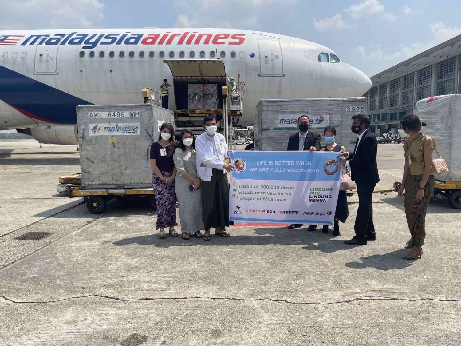 မလေးရှားနိုင်ငံမှ မြန်မာနိုင်ငံသို့လှူဒါန်းသော Astrazeneca အမှတ်တံဆိပ် ကိုဗစ်-၁၉ ရောဂါ ကာကွယ်ဆေး (၅)သိန်း doses သည် ယနေ့နံနက်ပိုင်းတွင် မလေးရှားနိုင်ငံ၊ ကွာလာလမ်ပူ လေဆိပ်မှ မလေးရှားလေကြောင်းလိုင်း ကုန်တင်ယာဉ်ဖြင့် ရန်ကုန်အပြည်ပြည်ဆိုင်ရာ လေဆိပ်သို့ ရောက်ရှိသည်။