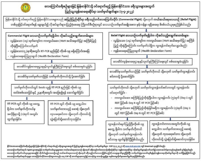 နိုင်ငံတကာလေကြောင်းခရီးစဉ်များကို ဧပြီ ၁၇ ရက်မှ စတင်ကာ ပြန်လည်ဖွင့်လှစ်ပေး ခဲ့သည့်အတွက် နိုင်ငံတကာလေကြောင်းခရီးစဉ် များဖြင့် မြန်မာနိုင်ငံသို့ ဝင်ရောက်လာမည့် မြန်မာနိုင်ငံသားနှင့် နိုင်ငံခြားသားခရီးသွားများအတွက် ပြည်သူ့ကျန်းမာရေးဆိုင်ရာ သတ်မှတ်ချက်များကို ကျန်းမာရေးဝန်ကြီးဌာနက ဧပြီ ၇ ရက်တွင် ထုတ်ပြန်ခဲ့သည်။