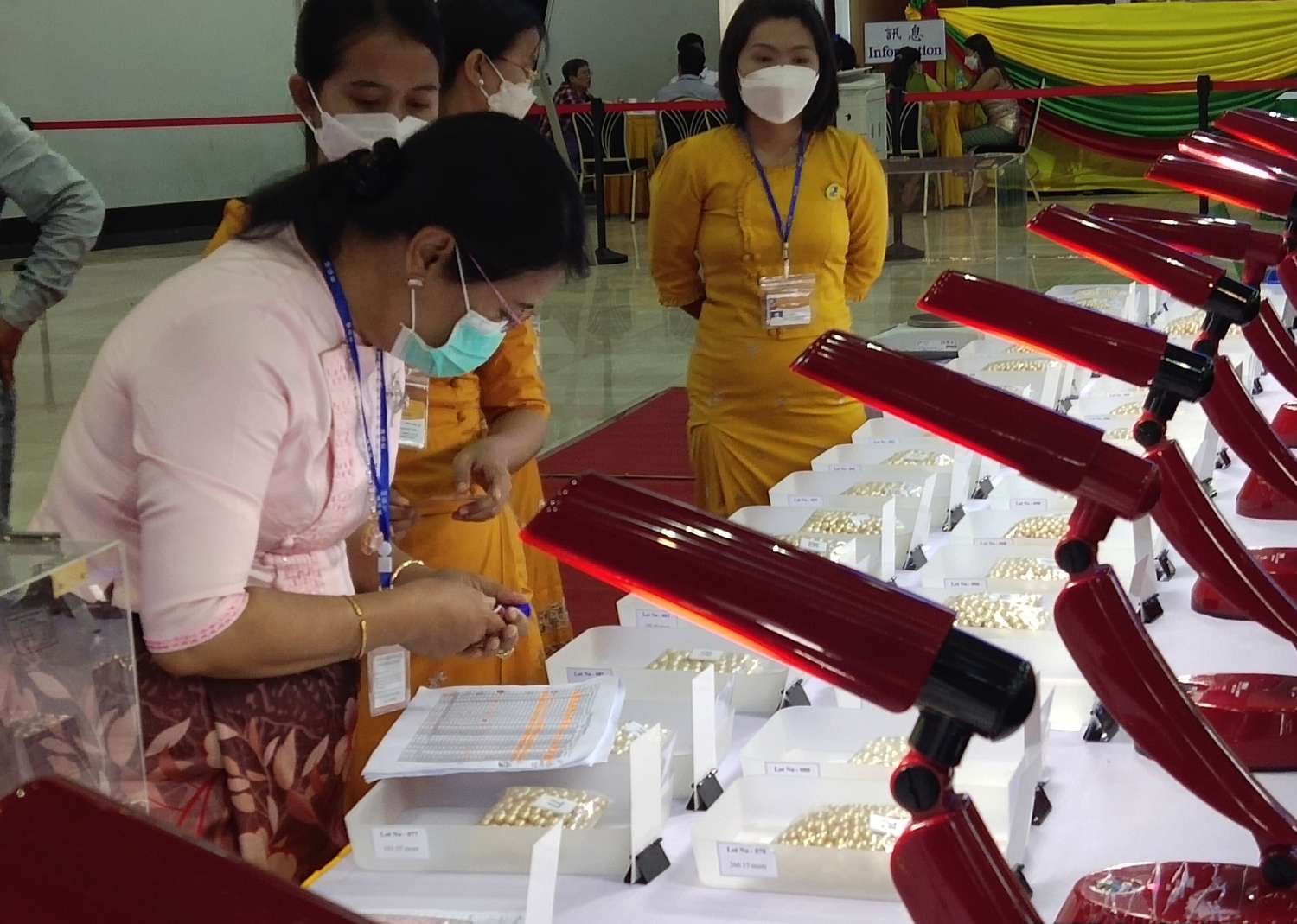 ထို့နောက် ပြည်တွင်း၊ ပြည်ပ ရတနာကုန်သည်များသည် ပြပွဲတွင် ရောင်းချမည့် ပုလဲအတွဲအမှတ် ၁ မှ အတွဲအမှတ် ၂၂၀ ထိ ပုလဲအတွဲများကို ကြည့်ရှုစစ်ဆေးကြပြီး ဈေးနှုန်းတင်သွင်းလွှာများကို တင်ဒါပုံးများ အတွင်းသို့ ထည့်သွင်းကြသည်။