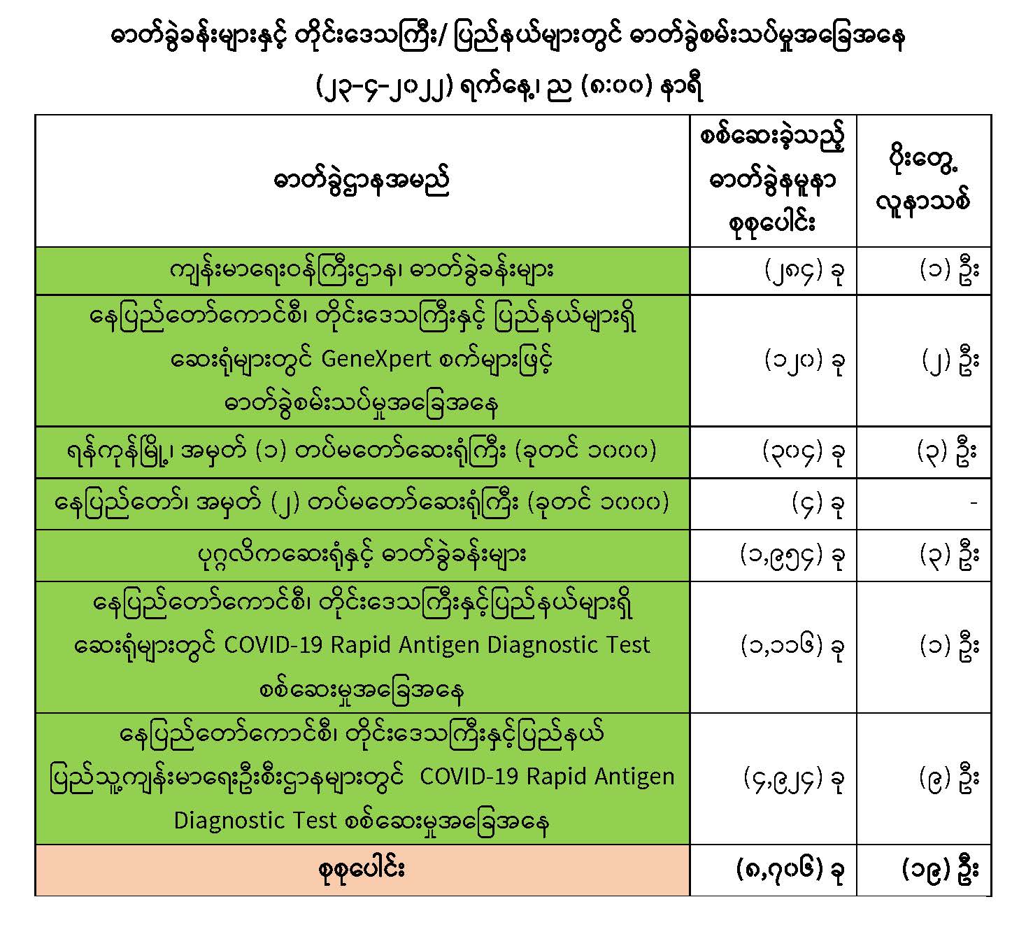 သို့ဖြစ်ပါ၍ ယနေ့အထိ ဓာတ်ခွဲနမူနာစုစုပေါင်း (၇,၈၉၁,၀၇၇) ခုအားစစ်ဆေးခဲ့ပြီး COVID-19 ဓာတ်ခွဲအတည်ပြုလူနာ စုစုပေါင်း (၆၁၂,၇၃၃) ဦး ရှိပြီ ဖြစ်ပါသည်။