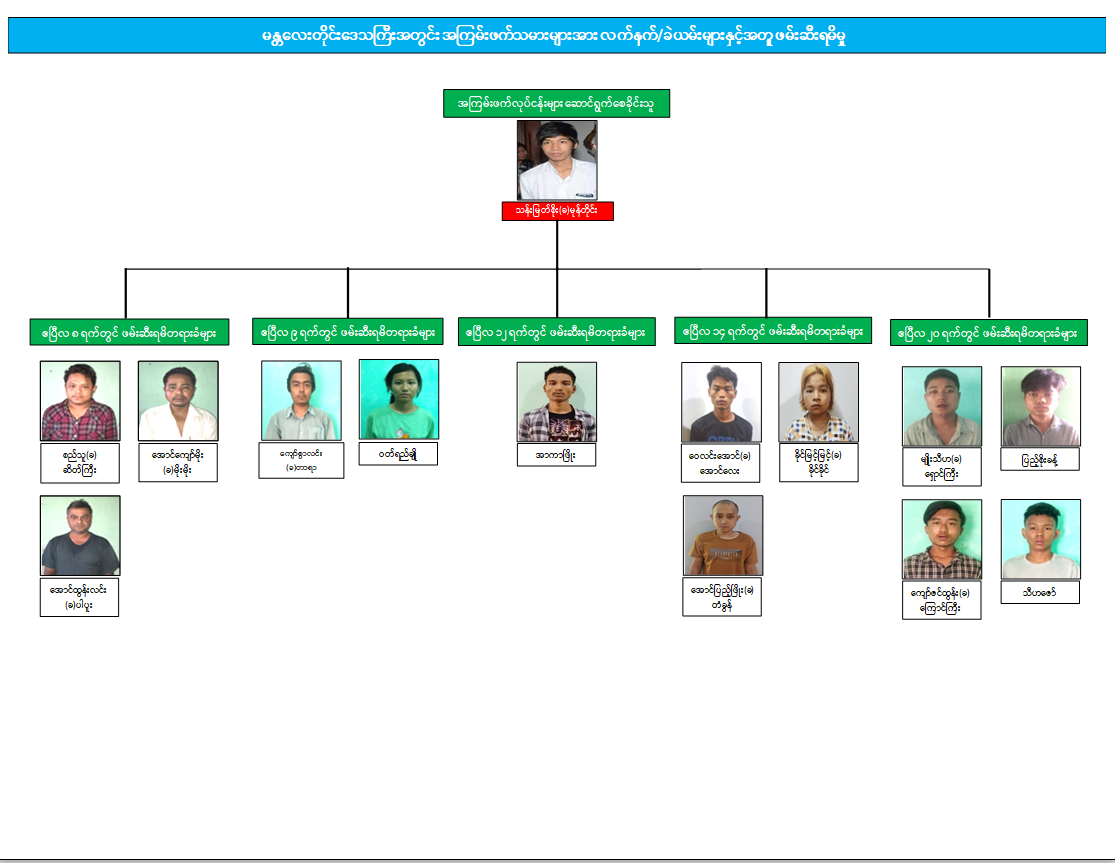 ဖမ်းဆီးရမိတရားခံများ၏ ထွက်ဆိုချက်အရ စည်သူ(ခ)ဆိတ်ကြီး၊ အောင်ကျော်မိုး (ခ)မိုးမိုး၊ ထွန်းလင်း(ခ)ပါပူး၊ ကျော်စွာလင်း(ခ)တာရာ၊ ဝတ်ရည်ချို တို့သည် မန္တလေးမြို့ရှိ ဇွဲထက်ရွှေဆိုင်အား ဓါးပြတိုက်ရန်အတွက် မန္တလေးတိုင်းဒေသကြီး၊ ပုသိမ်ကြီးမြို့နယ်၊ နန္ဒမြောက်ရွာရှိ ဖမ်းဆီးရန်ကျန် တရားခံ ဝင်းဘို ပိုင်ဆိုင်သည့် ဘဲခြံအတွင်း၌ ၃ ရက် ဇာတ်တိုက်လေ့ကျင့်မှုများ ပြုလုပ်ခဲ့သည့်အပြင် ဖမ်းဆီးရန်ကျန် တရားခံ ရှီခါ(ခ)Shika နှင့် အေးငုဝါခိုင်(ခ)မတောက် တို့ ခေါင်းဆောင်၍ ရတနာပုံဥယျာဉ် ဖွင့်ပွဲအခမ်းအနား ပြုလုပ်မည့် နေ့နှင့် သင်္ကြန်ကာလအတွင်း မန္တလေးမြို့အတွင်း၌ အဖျက်အမှောင့်လုပ်ငန်းများ ဆောင်ရွက်ရန် စီစဉ်နေစဉ် ဖမ်းဆီးရမိခဲ့ခြင်းဖြစ်ကြောင်း၊ ဆေးပစ္စည်းမျိုးစုံထည့်ထားသည့် ပီနံအိတ် ၂၇ အိတ်မှာ ရှမ်းပြည်နယ်(မြောက်ပိုင်း)၊ ကျောက်မဲမြို့နယ်အတွင်း လှုပ်ရှားနေသည့် TNLA အဖွဲ့၊ တပ်မဟာ(၂)သို့ ရောက်ရှိနေသော ဖမ်းဆီးရန်ကျန် တရားခံ သန်းမြတ်စိုး (ခ)မုန်တိုင်း ထံ ပို့ဆောင်ရန် ဝယ်ယူ စုဆောင်းထားခြင်းဖြစ်ကြောင်း ဖော်ထုတ်သိရှိရပါသည်။