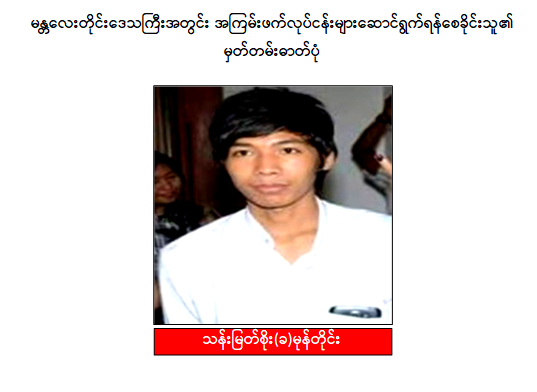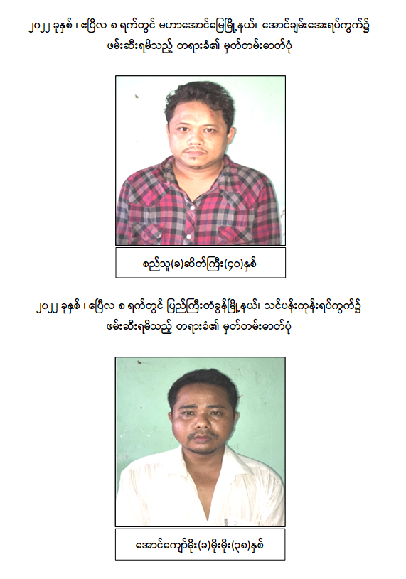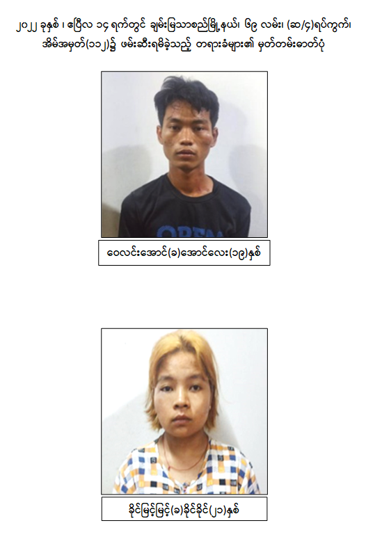 သို့ဖြစ်ပါ၍ ဖမ်းဆီးရမိတရားခံများအား ဥပဒေအရထိရောက်စွာ အရေးယူနိုင်ရေး ဆက်လက် ဆောင်ရွက်သွားမည်ဖြစ်ပြီး အကြမ်းဖက်မှု ဆောင်ရွက်နေသူများအား ပြည်သူတစ်ရပ်လုံးက ဝိုင်းဝန်းကာကွယ် တိုက်ဖျက်ကြရန်နှင့် ပြစ်မှုကျူးလွန်ရာတွင် ပါဝင်ပတ်သက်သူများ၊ နောက်ကွယ်မှ ထောက်ပံ့ပေးလျက်ရှိသော ဆက်စပ် တရားခံများအား အမြန်ဆုံးဖမ်းဆီးရမိရေး အတွက် ၎င်းတို့ပုန်းခိုရာနေရာများ၊ လှုပ်ရှားသွားလာနေထိုင်မှု သတင်းများရရှိပါက သက်ဆိုင်ရာသို့ လျှို့ဝှက်စွာသတင်းပေး တိုင်ကြားနိုင်ပါကြောင်း၊ သတင်းပေးသူနှင့် ဖမ်းဆီးပေးသူများအား ထိုက်တန်စွာလျှို့ဝှက်၍ ဆုငွေများ ပေးအပ်ချီးမြှင့်လျက်ရှိကြောင်းနှင့် မြို့ရွာများ အမြန်ဆုံး အေးချမ်းတည်ငြိမ်ရေးအတွက် ပြည်သူတစ်ရပ်လုံး ပူးပေါင်းပါဝင်ကြိုးပမ်း ဆောင်ရွက်နိုင်ပါရန် မေတ္တာရပ်ခံအပ်ပါကြောင်း အသိပေး သတင်းထုတ်ပြန်အပ်ပါသည်။
