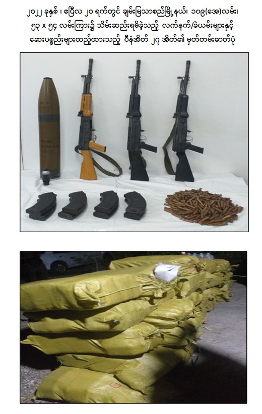 ဖမ်းဆီးရမိတရားခံများ၏ ထွက်ဆိုချက်အရ ဧပြီလ ၉ ရက် နံနက်ပိုင်းတွင် ချမ်းအေးသာစံ မြို့နယ်၊ ပြည်ကြီးမျက်မှန်ရပ်ကွက်ရှိ Yadanarpon Dynasty Hotel ၌ ကျော်စွာလင်း (ခ)တာရာ (၃၂)နှစ်နှင့် ဝတ်ရည်ချို (၂၁)နှစ်တို့ ၂ ဦးအား ဖမ်းဆီးရမိ ခဲ့ပြီး မဟာအောင်မြေမြို့နယ်၊ ရဲမွန်တောင်ရပ်ကွက်ရှိ ကျော်စွာလင်း(ခ)တာရာ ငှားရမ်းထားသော နေအိမ်၌ KA-25 သေနတ် ၁ လက်၊ လက်လုပ်သေနတ် ၁ လက်၊ ကျည်အိမ် ၇ ခု၊ ကျည်မျိုးစုံ ၃၂၆ တောင့်၊ အီနာဂါဗုံးသီး ၂၅ လုံး၊ လက်ပစ်ဗုံး ၅ လုံး၊ လက်လုပ်မိုင်း ၆ လုံး၊ ဒီတိုနေတာ ၃၇၅ ချောင်း၊ Keypad ဖုန်း ၂၀ လုံး၊ ဖောက်ခွဲရေးဆက်စပ် ပစ္စည်းများအား သိမ်းဆည်းရမိခဲ့ပါသည်။