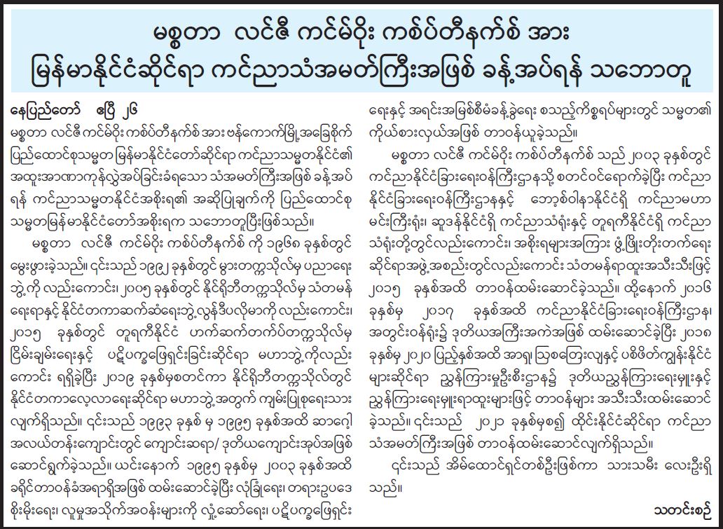 မစ္စတာ လင်ဇီကင်မ်ဝိုး ကစ်ပ်တီနက်စ်အား မြန်မာနိုင်ငံဆိုင်ရာ ကင်ညာသံအမတ်ကြီးအဖြစ် ခန့်အပ်ရန် သဘောတူ 04/27/2022
