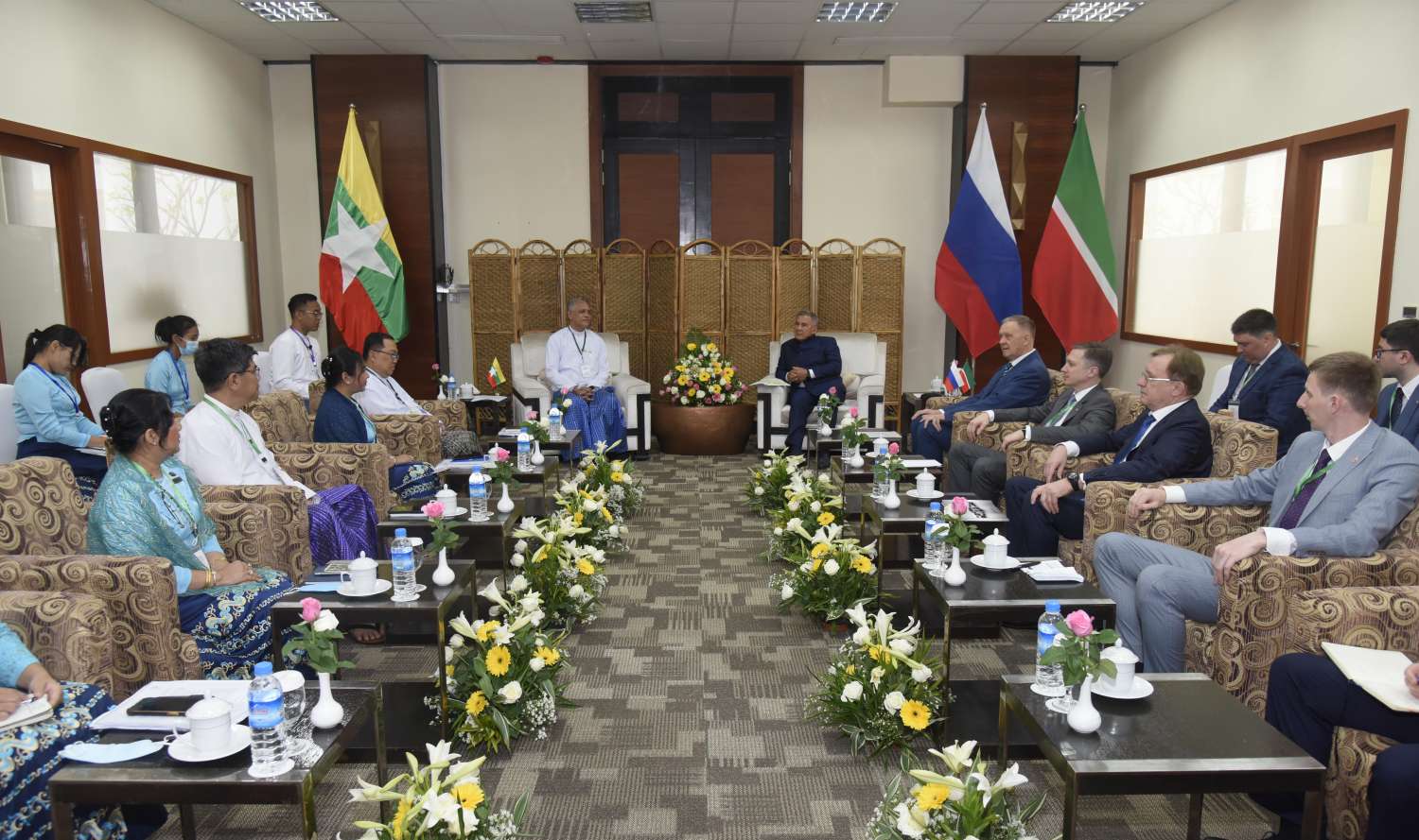 ဆက်လက်၍ Republic of the Tatarstan သမ္မတ H.E. Mr. Rustam Nurgaliyevich Minnikhanov က နှစ်ဖက်စီးပွားရေး ပူးပေါင်းဆောင်ရွက်နိုင်သော နယ်ပယ်အသစ်များမှ တစ်ဆင့်အကျိုးတူ ဖက်စပ်စီမံကိန်းများ လက်တွေ့အကောင်အထည်ဖော် ဆောင်ရွက်နိုင်ရေး၊ မော်တော်ယာဉ် ထုတ်လုပ်မှုအပါအဝင် ပြန်လည်ပြုပြင်ရေး လုပ်ငန်းများတွင် ပူးပေါင်းဆောင်ရွက်ရေး၊ နှစ်ဖက်အပြန်အလှန် အလုပ်သဘောခရီးစဉ်များ ဆောင်ရွက်ရေး၊ မြန်မာနိုင်ငံမှ ပညာသင်များအား တာတာစတန်၏မြို့တော် ကာဇန်ရှိ အဆင့်မြင့်တက္ကသိုလ်များတွင် ပညာသင်ကြားနိုင်ရေး ကိစ္စရပ်များနှင့်စပ်လျဉ်း၍ ပြောကြားခဲ့သည်။ မြန်မာနိုင်ငံဆိုင်ရာ ရုရှားဖက်ဒရေးရှင်း သံအမတ်ကြီး H.E. Dr. Nikolay LISTOPADOV က ဆွေးနွေးပွဲမှတစ်ဆင့် နှစ်ဖက်ချစ်ကြည် ရင်းနှီးမှုနှင့်အတူ စီးပွားရေးနယ်ပယ် အသီးအသီးတွင် ပိုမိုကျယ်ပြန့်စွာ ပူးပေါင်းဆောင်ရွက် သွားနိုင်ရေးအတွက် သံရုံးအနေဖြင့် လိုအပ်သည့်ကိစ္စရပ်များကို ပူးပေါင်းဆောင်ရွက် သွားမည်ဖြစ်ကြောင်း ပြောကြားသည်။