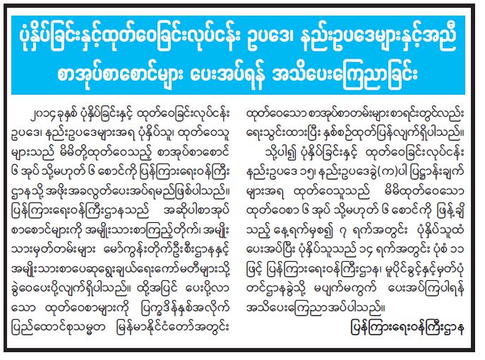 ပုံနှိပ်ခြင်းနှင့်ထုတ်ဝေခြင်းလုပ်ငန်း ဥပဒေ၊ နည်းဥပဒေများနှင့်အညီ စာအုပ်စာစောင်များ ပေးအပ်ရန် အသိပေးကြေညာခြင်း 04/29/2022