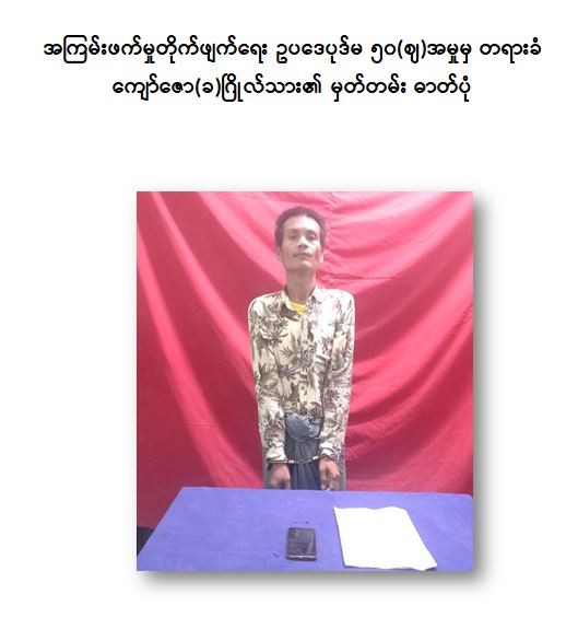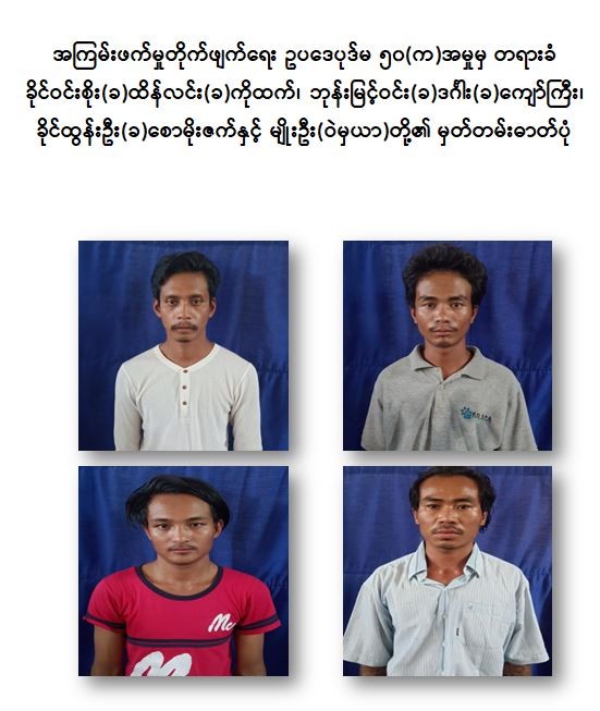 ရန်ကုန်တိုင်းဒေသကြီး၊ လှိုင်သာယာ (အရှေ့ပိုင်း) မြို့နယ်၊ အမှတ်(၇) ရပ်ကွက်နေ စိုးနိုင် (ဘ) ဦးစောသည် ၂၀၂၁ ခုနှစ်၊ ဖေဖော်ဝါရီလမှ ၂၀၂၂ ခုနှစ်၊ ဖော်ဝါရီလ ၁၂ ရက်အတွင်း လှိုင်သာယာ (အနောက်ပိုင်း) မြို့နယ်အတွင်းပြုလုပ်သည့် ဆူပူဆန္ဒပြမှုများတွင် ကိုယ်တိုင်ပါဝင်ခြင်း၊ ပြည်ထောင်စုသမ္မတမြန်မာနိုင်ငံတော်၊ အကြမ်းဖက်မှု တိုက်ဖျက်ရေး ဗဟိုအဖွဲ့၏ အမိန့်ကြော်ငြာစာအမှတ်(၂/၂၀၂၁)ဖြင့် အကြမ်းဖက် အုပ်စုများအဖြစ် သတ်မှတ်ကြေညာ ထားသည့် အဖွဲ့အစည်းများနှင့် ဆက်သွယ်ခြင်း၊ လက်လုပ်မိုင်းများ စမ်းသပ်ထုတ်လုပ်ပေးခြင်း၊ လက်နက်၊ ခဲယမ်းများသယ်ယူ ပို့ဆောင်ပေးခြင်းကြောင့်လည်းကောင်း၊ လှိုင်သာယာ (အနောက်ပိုင်း) မြို့နယ်၊ အမှတ် (၁၈) ရပ်ကွက်နေ ကျော်ဝင်းထွဋ် (ခ) ကျော်ကြီး (ဘ) ဦး တက်နေဝင်း၊ အမှတ်(၁၆) ရပ်ကွက်နေ ဖြိုးကိုကို(ခ)ဖြိုးကို(ဘ)ဦးထွန်းမင်းနှင့် သက်ပိုင်ဦး(ခ) ပိုင်လေးတို့ ၃ ဦးသည် လှိုင်သာယာမြို့နယ်အတွင်းပြုလုပ်သည့် ဆူပူဆန္ဒပြမှုများတွင် ကိုယ်တိုင် ပါဝင်ခြင်း၊ လက်နက်များသိုဝှက်သိမ်းဆည်းခြင်း၊ တိုင်းရင်းသားလက်နက်ကိုင်အဖွဲ့ နယ်မြေ အတွင်း၌ အကြမ်းဖက်သင်တန်းများ တက်ရောက်ခဲ့ခြင်းတို့ကြောင့်လည်းကောင်း၊ ရွှေပြည်သာ မြို့နယ်၊ အမှတ်(၂၃)ရပ်ကွက်နေ ခိုင်ဝင်းစိုး (ခ) ထိန်လင်း(ခ) ကိုထက်(ဘ)ဦးမြင့်မောင်၊ ဘုန်းမြင့်ဝင်း (ခ) ဒင်္ဂါး(ခ) ကျော်ကြီး (ဘ) ဦးမောင်မောင်ထွေး၊ မျိုးဦး(ဘ)ဦးမျိုးညွန့်အောင်နှင့် မှော်ဘီမြို့နယ်၊ အုတ်စက်အလုပ်သမားဝန်းနေ ခိုင်ထွန်းဦး (ခ) စောမိုးဇက် (ခ) ချက်ကြီး(ဘ) ဦးစိန်ထွန်းရီတို့ ၄ ဦးသည် ၂၀၂၁ ခုနှစ်၊ ဖေဖော်ဝါရီလအတွင်း ရွှေပြည်သာမြို့နယ်အတွင်း ပြုလုပ်သည့် ဆူပူဆန္ဒပြမှုများ တွင်ပါဝင်ခြင်း၊ ပြည်ထောင်စုသမ္မတမြန်မာနိုင်ငံတော်၊ အကြမ်းဖက်မှု တိုက်ဖျက်ရေးဗဟိုအဖွဲ့၏ အမိန့်ကြော်ငြာစာအမှတ်(၂/၂၀၂၁)ဖြင့် အကြမ်းဖက်အုပ်စုများအဖြစ် သတ်မှတ်ကြေညာထားသည့် အဖွဲ့အစည်းများနှင့် ဆက်သွယ်ခြင်း၊ လက်နက်၊ ခဲယမ်းများ သိုဝှက်သိမ်းဆည်းပေးခြင်းနှင့် ပို့ဆောင်ပေးခြင်းများ ကြောင့် လည်းကောင်း၊ ဧရာဝတီတိုင်းဒေသကြီး၊ ပန်းတနော်မြို့နယ်၊ မိန်းမပြေးကျေးရွာနေ ကျော်ဇော(ခ)ဂြိုလ်သား(ဘ)ဦးထွန်းအောင်သည် ၂၀၂၁ ခုနှစ်၊ ဖေဖော်ဝါရီလမှ ၂၀၂၂ ခုနှစ်၊ မတ် ၈ ရက်အတွင်း မြောက်ဥက္ကလာပမြို့နယ်အတွင်း ပြုလုပ်သည့် ဆူပူဆန္ဒပြမှုများတွင် ကိုယ်တိုင် ပါဝင်ခြင်း၊ ဖောက်ခွဲဖျက်ဆီးရေးလုပ်ငန်းများ လုပ်ကိုင်ရာတွင်အားပေးကူညီခြင်း တို့ကြောင့် လည်းကောင်း စစ်အုပ်ချုပ်ရေး (Martial Law) စစ်ခုံရုံးဖွဲ့၍ စစ်ဆေးမှုများ ဆောင်ရွက်ခဲ့ရာ အကြမ်းဖက်မှုတိုက်ဖျက်ရေးဥပဒေပုဒ်မ ၅၀(က)နှင့် ၅၀(ဈ)တို့အရ ၂၀၂၂ ခုနှစ်၊ ဧပြီ ၂၉ ရက်တွင် “ထောင်ဒဏ်တစ်သက်”