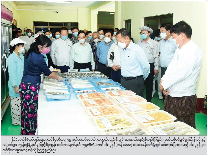 ဦးစွာ နိုင်ငံတော်စီမံအုပ်ချုပ်ရေးကောင်စီဒုတိယဥက္ကဋ္ဌ ဒုတိယတပ်မတော် ကာကွယ်ရေးဦးစီးချုပ် ကာကွယ်ရေးဦးစီး ချုပ်(ကြည်း)နှင့် အဖွဲ့ဝင်များသည် စက်ရုံ သို့ရောက်ရှိကြပြီး ခင်းကျင်း ပြထားသည့် GAqP (Good Aquaculture Practices) လုပ်ငန်းစဉ်အတိုင်း ထုတ်လုပ်ထားသည့် ငါး၊ ပုစွန်များ ထုပ်ပိုးထားမှုအဆင့်ဆင့် ကို ကြည့်ရှုကြသည်။