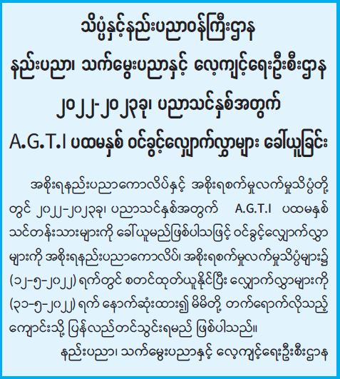 သိပ္ပံနှင့်နည်းပညာဝန်ကြီးဌာန နည်းပညာ၊ သက်မွေးပညာနှင့် လေ့ကျင့်ရေးဦးစီးဌာန ၂၀၂၂-၂၀၂၃ခု၊ ပညာသင်နှစ်အတွက် A.G.T.I ပထမနှစ် ဝင်ခွင့်လျှောက်လွှာများ ခေါ်ယူခြင်း 05/06/2022