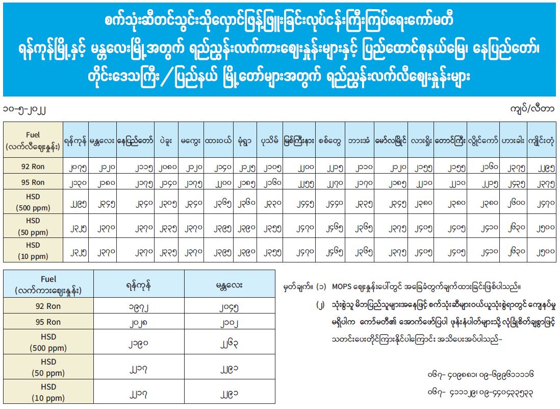 စက်သုံးဆီ တင်သွင်းသိုလှောင်ဖြန့်ဖြူးခြင်းလုပ်ငန်းကြီးကြပ်ရေးကော်မတီ ရန်ကုန်မြို့နှင့် မန္တလေးမြို့အတွက် ရည်ညွှန်းလက်ကားဈေးနှုန်းများနှင့် ပြည်ထောင်စုနယ်မြေ၊ နေပြည်တော်၊ တိုင်းဒေသကြီး/ပြည်နယ် မြို့တော်များအတွက် ရည်ညွှန်းလက်လီဈေးနှုန်းများ
