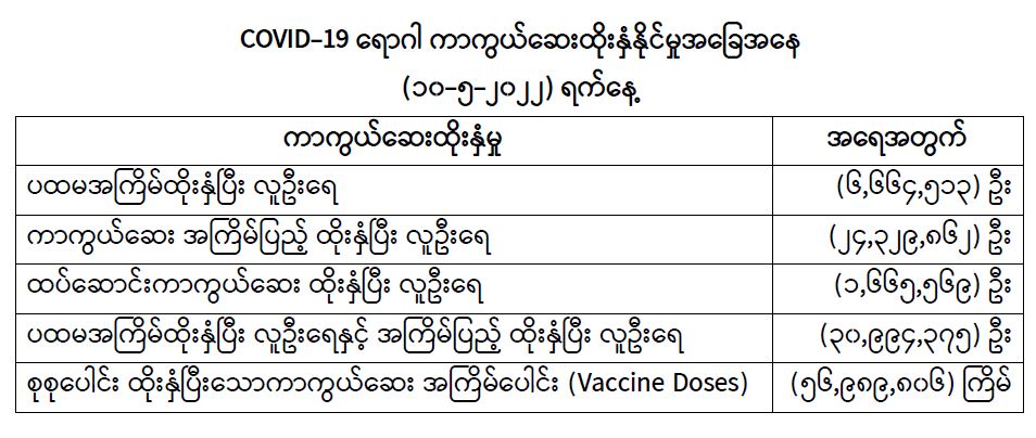 COVID-19 ရောဂါ ကာကွယ်ထိန်းချုပ်ရေးအတွက် တိုင်းဒေသကြီး/ပြည်နယ်များတွင် COVID-19 ရောဂါကာကွယ်ဆေးကို ဦးတည်အုပ်စုများသတ်မှတ်၍ ထိုးနှံပေးလျက်ရှိရာ (၁၀-၅-၂၀၂၂) ရက်နေ့အထိ လူဦးရေ စုစုပေါင်း (၃၀,၉၉၄,၃၇၅) ဦးအား ထိုးနှံပေးပြီးဖြစ်၍ ပထမအကြိမ် ထိုးနှံပြီးစီးသူ (၆,၆၆၄,၅၁၃) ဦး၊ ကာကွယ်ဆေးအကြိမ်ပြည့် ထိုးနှံပြီးစီးသူ (၂၄,၃၂၉,၈၆၂) ဦးနှင့် ထပ်ဆောင်းကာကွယ်ဆေး ထိုးနှံပြီးစီးသူ (၁,၆၆၅,၅၆၉) ဦးရှိပြီဖြစ်ပါသည်။ သို့ဖြစ်ပါ၍ (၁၀-၅-၂၀၂၂) ရက်နေ့ အထိ မြန်မာနိုင်ငံတွင် COVID-19 ရောဂါကာကွယ်ဆေး အကြိမ်ရေစုစုပေါင်း (၅၆,၉၈၉,၈၀၆) ကြိမ် ထိုးနှံပြီးဖြစ်ပါသည်။