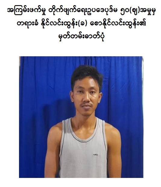 ရန်ကုန်တိုင်းဒေသကြီး၊ ဒဂုံမြို့သစ်(မြောက်ပိုင်း)မြို့နယ်၊ (၅၀)ရပ်ကွက်နေ နိုင်လင်းထွန်း(ခ) စောနိုင်လင်းထွန်း(ဘ) ဦးလှသောင်းသည် ၂၀၂၁ ခုနှစ်၊ ဖေဖော်ဝါရီလမှ မတ်လအထိ ကာလအတွင်း ဒဂုံမြို့သစ်(မြောက်ပိုင်း) မြို့နယ်အတွင်း ဆူပူဆန္ဒပြမှုများ၌ ပါဝင်ခဲ့ခြင်း၊ ပြည်ထောင်စုသမ္မတ မြန်မာနိုင်ငံတော်၊ အကြမ်းဖက်မှုတိုက်ဖျက်ရေး ဗဟိုအဖွဲ့၏ အမိန့်ကြော်ငြာစာအမှတ် (၂/၂၀၂၁)ဖြင့် အကြမ်းဖက်အုပ်စုများအဖြစ် သတ်မှတ်ကြေညာထားသည့် အဖွဲ့အစည်းများနှင့် ဆက်သွယ်ခြင်း၊ တိုင်းရင်းသား လက်နက်ကိုင်အဖွဲ့ နယ်မြေအတွင်း သင်တန်းတက်ရောက်ခြင်း၊ ဖောက်ခွဲဖျက်ဆီးရေး ပစ္စည်းများကို ဖြန့်ဝေခဲ့ခြင်း၊ လုံခြုံရေးတပ်ဖွဲ့ဝင်များအား ပစ်ခတ်တိုက်ခိုက်ရာတွင် ပါဝင်ခဲ့ခြင်း၊ ဌာနဆိုင်ရာ အဆောက်အဦများနှင့် လမ်း၊ တံတားများအား မိုင်းထောင် ဖောက်ခွဲခဲ့ခြင်းတို့ကြောင့် စစ်အုပ်ချုပ်ရေး (Martial Law) စစ်ခုံရုံးဖွဲ့၍ စစ်ဆေးမှုများ ဆောင်ရွက်ခဲ့ရာ အကြမ်းဖက်မှုတိုက်ဖျက်ရေး ဥပဒေပုဒ်မ- ၅၀(ဈ)အရ ၎င်းအား ၂၀၂၂ ခုနှစ်၊ မေ ၁၁ ရက်တွင် “ထောင်ဒဏ်တစ်သက်” အမိန့်ချမှတ်လိုက်ကြောင်း သိရှိရသည်။