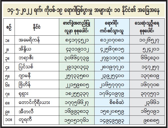 ၁၄- ၅-၂၀၂၂ ရက်၊ ကိုဗစ်-၁၉ ရောဂါဖြစ်ပွားမှု အများဆုံး ၁၀ နိုင်ငံ၏ အခြေအနေ
