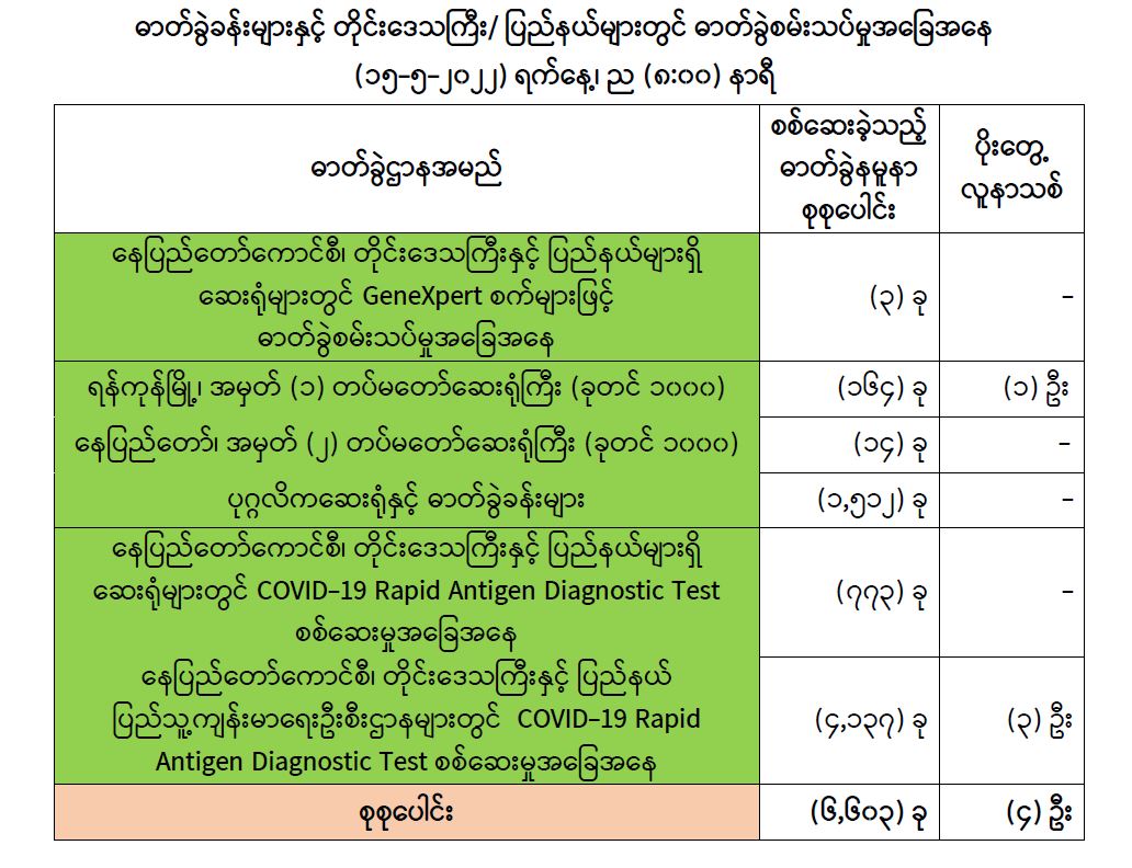 သို့ဖြစ်ပါ၍ ယနေ့အထိ ဓာတ်ခွဲနမူနာစုစုပေါင်း (၈,၀၈၃,၃၂၆) ခုအား စစ်ဆေးခဲ့ပြီး COVID-19 ဓာတ်ခွဲအတည်ပြုလူနာ စုစုပေါင်း (၆၁၃,၁၄၀) ဦး ရှိပြီ ဖြစ်ပါသည်။