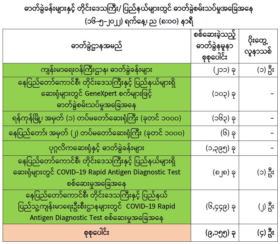 သို့ဖြစ်ပါ၍ ယနေ့အထိ ဓာတ်ခွဲနမူနာစုစုပေါင်း (၈,၀၉၂,၄၈၁) ခုအား စစ်ဆေးခဲ့ပြီး COVID-19 ဓာတ်ခွဲအတည်ပြုလူနာ စုစုပေါင်း (၆၁၃,၁၄၄) ဦး ရှိပြီ ဖြစ်ပါသည်။