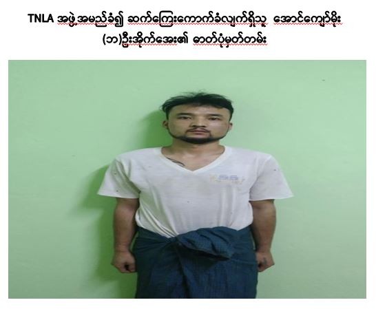 ၎င်းဖမ်းဆီးရမိတရားခံသည် ၂၀၂၁ ခုနှစ် အောက်တိုဘာမှ ၂၀၂၂ ခုနှစ်၊ မေလ ၁၆ ရက်အထိ TNLA အဖွဲ့အမည်ခံ၍ လားရှိုး၊ မန္တလေး၊ ကျောက်ဆည်၊ တောင်ကြီးမြို့များရှိ စက်သုံးဆီအရောင်းဆိုင်၊ အထည်ဆိုင်၊ ကား/ ဆိုင်ကယ် အရောင်းဆိုင်၊ လျှပ်စစ်ပစ္စည်းဆိုင်၊ ကုန်စုံဆိုင်၊ ဟိုတယ်လုပ်ငန်းရှင်များထံသို့ ဖုန်းဖြင့်ဆက်သွယ်ကာ ၂၅ ကြိမ်ခန့် ဆက်ကြေးငွေတောင်းခံခဲ့ပြီး စုစုပေါင်း ဆက်ကြေးငွေ ၂၁,၉၅၀,၀၀၀ ကျပ် ကောက်ခံရရှိခဲ့ကြောင်း၊ ၂၀၂၂ ခုနှစ်၊ မေ ၁၆ ရက်တွင် Royal Ground Hotel ၌ တည်းခိုနေထိုင်စဉ် နယ်မြေခံလုံခြုံရေးတပ်ဖွဲ့ဝင်များမှ တာဝန်သိပြည်သူများ၏ သတင်းပေးပို့မှုအရ ဖမ်းဆီးရမိခဲ့ခြင်းဖြစ်ကြောင်းနှင့် ဖမ်းဆီးရမိသူ ၂ ဦးအား တရားဥပဒေအရ လိုအပ်သလို အရေးယူနိုင်ရေး ဆက်လက်ဆောင်ရွက်လျက်ရှိကြောင်း သတင်းရရှိသည်။