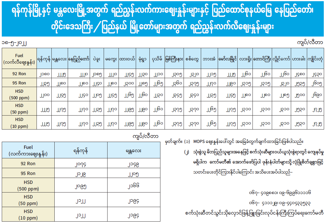 ရန်ကုန်မြို့နှင့် မန္တလေးမြို့အတွက် ရည်ညွှန်းလက်ကားဈေးနှုန်းများနှင့် ပြည်ထောင်စုနယ်မြေ နေပြည်တော်၊ တိုင်းဒေသကြီး/ ပြည်နယ် မြို့တော်များအတွက် ရည်ညွှန်းလက်လီဈေးနှုန်းများ 05/18/2022