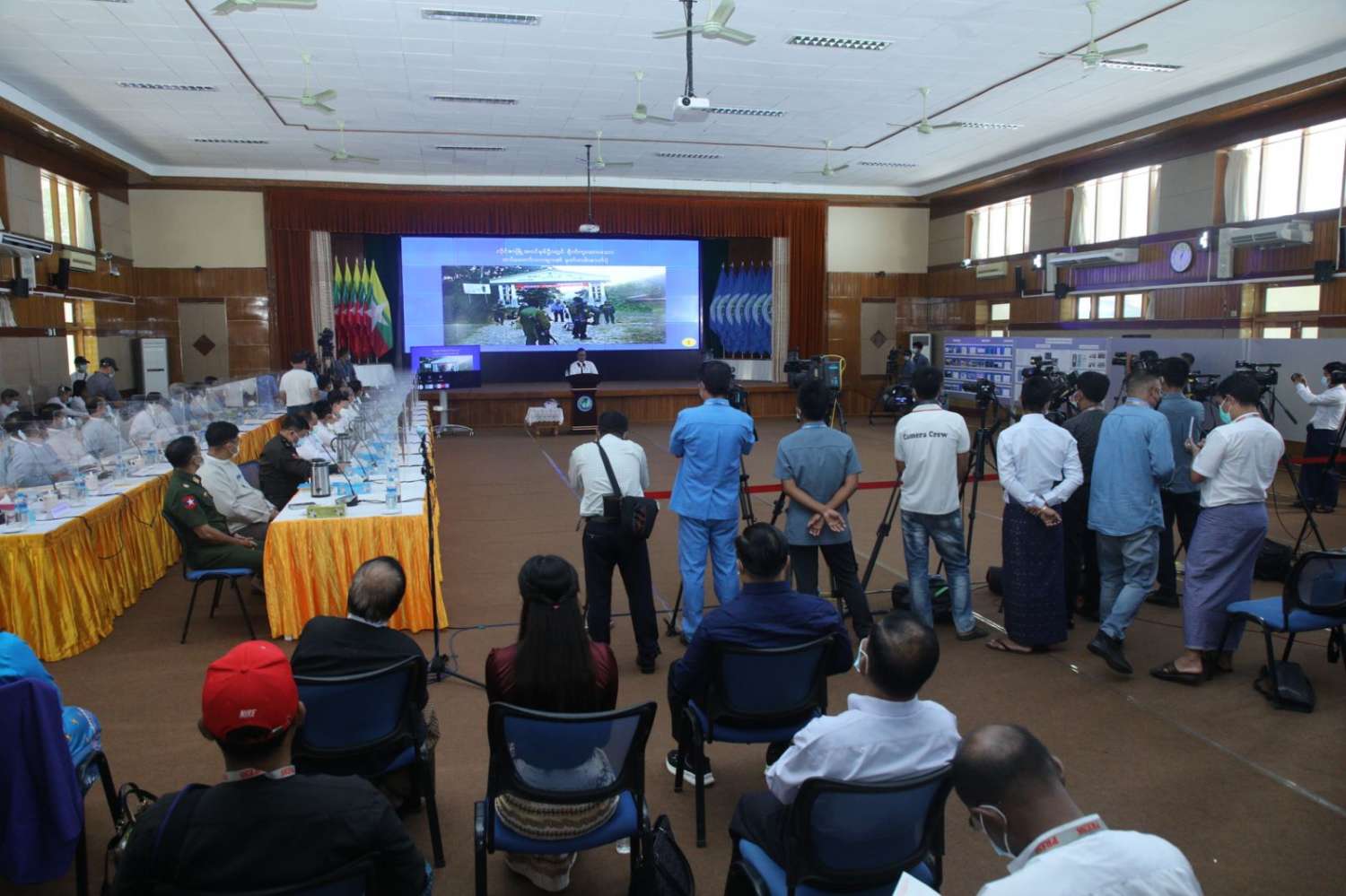 သတင်းစာရှင်းလင်းပွဲမစတင်မီ တက်ရောက်လာကြသူများအား တာဝန်ရှိသူများက ကိုဗစ်-၁၉ ရောဂါကြိုတင်ကာကွယ်ရေး အတွက် လိုအပ်သည့် ကျန်းမာရေးဆိုင်ရာစစ်ဆေးမှုများ ဆောင်ရွက်ပေးပြီး သတ်မှတ်အကွာအဝေးအတိုင်း နေရာချထာပေးသည်။