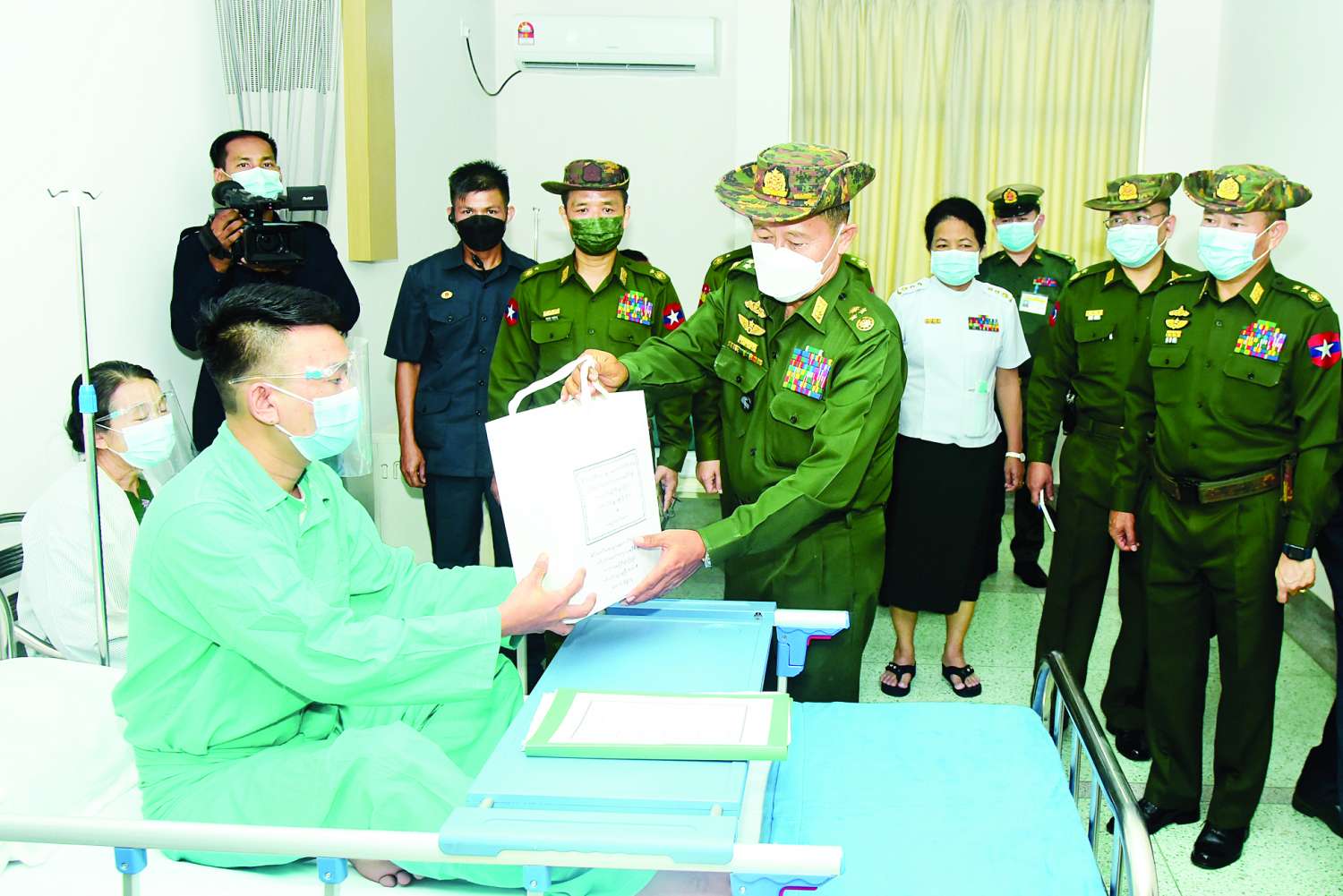 ယင်းနောက် နိုင်ငံတော်စီမံအုပ်ချုပ်ရေးကောင်စီ ဒုတိယဥက္ကဋ္ဌ ဒုတိယတပ်မတော် ကာကွယ်ရေးဦးစီးချုပ် ကာကွယ်ရေးဦးစီးချုပ်(ကြည်း)သည် ဆေးရုံတွင် တာဝန်ထမ်းဆောင်လျက်ရှိသည့် ကျန်းမာရေးဝန်ထမ်းများအတွက် ချီးမြှင့်ငွေများကို ပေးအပ်ရာ ဆေးရုံအုပ်ကြီးက လက်ခံရယူခဲ့ကြောင်း သိရသည်။