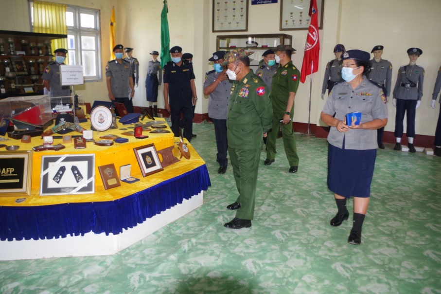 ပြည်ထောင်စုဝန်ကြီးနှင့် အဖွဲ့သည် ရဲအရာရှိလေ့ကျင့်ရေးကျောင်းရှိ E-Library နှင့် စာကြည့်တိုက်၊ နည်းပညာပြခန်း၊ Audio Lab၊ သရုပ်ပြခန်း၊ သင်တန်းသားစာသင်ခန်းများ၊ ကွန်ပျူတာလက်တွေ့ခန်း၊ ကျောင်းပြတိုက်၊ ဆောက်လုပ်ဆဲ ၄ ထပ်စာသင်ဆောင်၊ အရာရှိ ရိပ်သာနှင့်စစ်နည်းဗျူဟာ လေ့ကျင့်ရေးကွင်း၌ သင်တန်းသားများ စစ်နည်းဗျူဟာဘာသာရပ် သင်ကြားလေ့ကျင့်နေမှုတို့ကို လှည့်လည်ကြည့်ရှုစစ်ဆေးသည်။