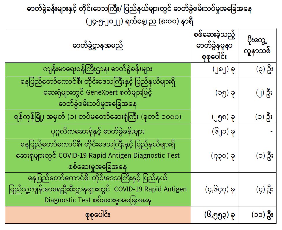 သို့ဖြစ်ပါ၍ ယနေ့အထိ ဓာတ်ခွဲနမူနာစုစုပေါင်း (၈,၁၅၄,၀၇၂) ခုအား စစ်ဆေးခဲ့ပြီး COVID-19 ဓာတ်ခွဲအတည်ပြုလူနာ စုစုပေါင်း (၆၁၃,၂၃၈) ဦး ရှိပြီ ဖြစ်ပါသည်။