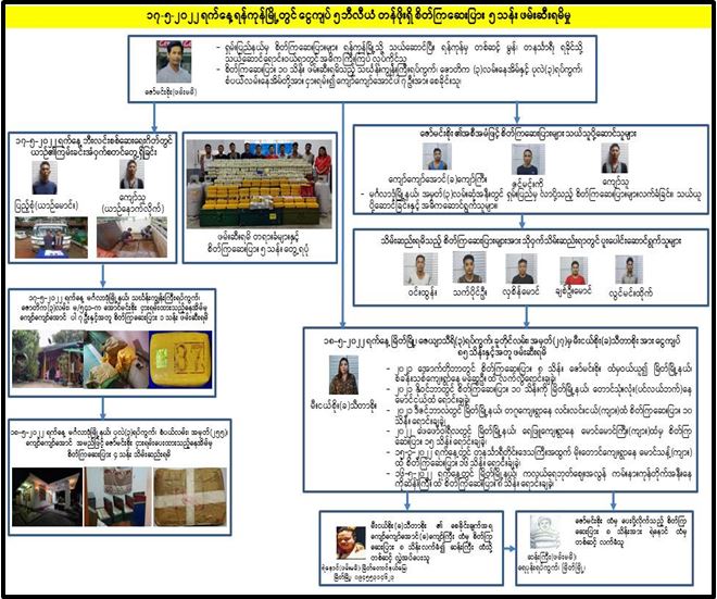 ဖြစ်စဉ်မှာ မူးယစ်ဆေးဝါးတားဆီးနှိမ်နင်းရေးရဲတပ်ဖွဲ့မှ တပ်ဖွဲ့ဝင်များပါဝင်သော ပူးပေါင်းအဖွဲ့သည် မေ ၁၇ ရက် ညနေ ၃ နာရီခွဲတွင် မင်္ဂလာဒုံမြို့နယ်၊ သင်္ဃန်းကျွန်းကြီး ရပ်ကွက်၊ ဇောတိက(၃) လမ်းရှိ ဇော်မင်းစိုး၏နေအိမ်ကို သတင်းအရ ဝင်ရောက်ရှာဖွေရာ ကျော်ကျော်အောင်၊ ဝင်းထွန်း၊ လှစိန်မောင်၊ ချစ်ဦးမောင်၊ ဇင်မင်းကို၊ လွင်မင်းထိုက်နှင့် သက်ပိုင်ဦး တို့ ၇ ဦးနှင့်အတူ စိတ်ကြွရူးသွပ်ဆေးပြား ၁၀ သိန်းနှင့် မြန်မာငွေကျပ်သိန်း ၁၅၀ တို့ သိမ်းဆည်းရမိခဲ့ကြောင်း၊ စစ်ဆေးဖော်ထုတ် ချက်အရ ည ၁၂ နာရီတွင် မင်္ဂလာဒုံမြို့နယ်၊ ပုလဲ(၃)ရပ်ကွက်၊ စံပယ်လမ်းရှိ ဇော်မင်းစိုး က ကျော်ကျော်အောင် အမည်ဖြင့် ငှားပေးထားသည့်နေအိမ်မှ စိတ်ကြွရူးသွပ်ဆေးပြား သိန်း ၄၀ ထပ်မံ သိမ်းဆည်းရမိခဲ့သဖြင့် စုစုပေါင်းဒေသ ကာလတန်ဖိုးငွေကျပ် ၅ ဘီလီယံတန်ဖိုးရှိ စိတ်ကြွရူးသွပ်ဆေးပြား သိန်း ၅၀ သိမ်းဆည်းရမိခဲ့ကြောင်း၊ ကွင်းဆက်အရ မေ ၁၈ ရက် နံနက် ၁၀ နာရီတွင် မြိတ်မြို့၊ မြိတ်တောင်နယ်မြေ၊ ဇေယျာသီရိ(၃)ရပ်ကွက်၊ ခူဒိုင်လမ်းနေ မမီးငယ်စိုး(ခ) သီတာစိုး ကို မြန်မာငွေကျပ် ၈၅ သိန်းနှင့်လည်းကောင်း၊ ပြည့်စုံနှင့် ကျော်သူတို့အား HINO ၆ ဘီး မော်တော်ယာဉ်တစ်စီး၊ မြန်မာငွေကျပ်သိန်း ၄၀ တို့နှင့်လည်းကောင်း အသီးသီးဖမ်းဆီးရမိခဲ့ပြီး စိတ်ကြွရူးသွပ်ဆေးပြားများကို ရှမ်းပြည်နယ်မှ ရန်ကုန်မြို့သို့ သယ်ဆောင်ပြီး ဖမ်းမိနေအိမ်များ၌ သိုလှောင်၍ တနင်္သာရီတိုင်းဒေသကြီးနှင့် ရခိုင်ပြည်နယ်တို့သို့ သယ်ဆောင်ရောင်းဝယ်ကြောင်းနှင့် သယ်ဆောင်ရောင်းဝယ်သူ ဇော်မင်းစိုးမှာ ထွက်ပြေးတိမ်းရှောင်လျက်ရှိသဖြင့် ၎င်းတို့အား ဥပဒေအရ အရေးယူထားရှိပြီး ကွင်းဆက်ပြစ်မှုကျူးလွန်သူများအား ဆက်လက်စစ်ဆေး ဖော်ထုတ်လျက် ရှိကြောင်း သိရသည်။