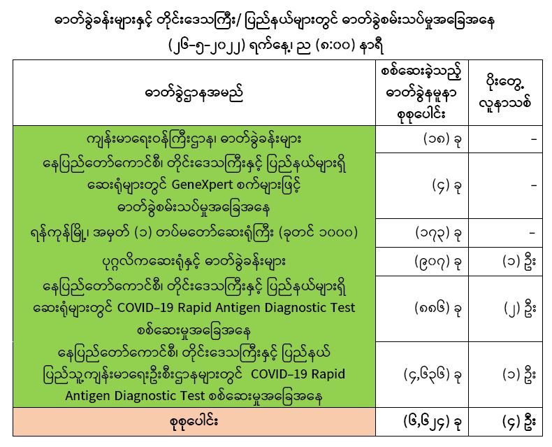 သို့ဖြစ်ပါ၍ ယနေ့အထိ ဓာတ်ခွဲနမူနာစုစုပေါင်း (8,168,040) ခုအား စစ်ဆေးခဲ့ပြီး COVID-19 ဓာတ်ခွဲအတည်ပြုလူနာ စုစုပေါင်း (613,260) ဦးရှိပြီ ဖြစ်ပါသည်။