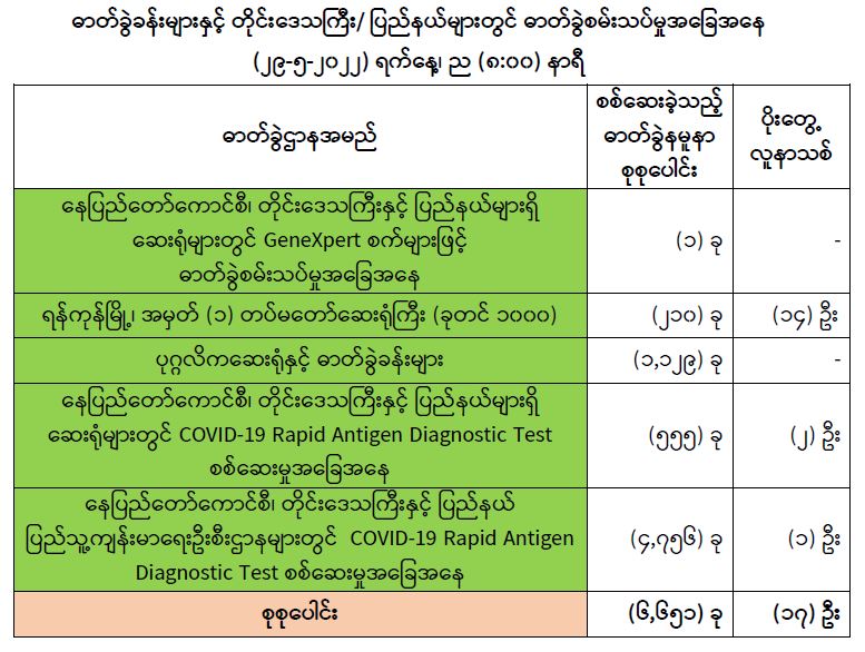 သို့ဖြစ်ပါ၍ ယနေ့အထိ ဓာတ်ခွဲနမူနာစုစုပေါင်း (8,191,029) ခုအားစစ်ဆေးခဲ့ပြီး COVID-19 ဓာတ်ခွဲအတည်ပြုလူနာစုစုပေါင်း (613,315) ဦး ရှိပြီဖြစ်ပါသည်။