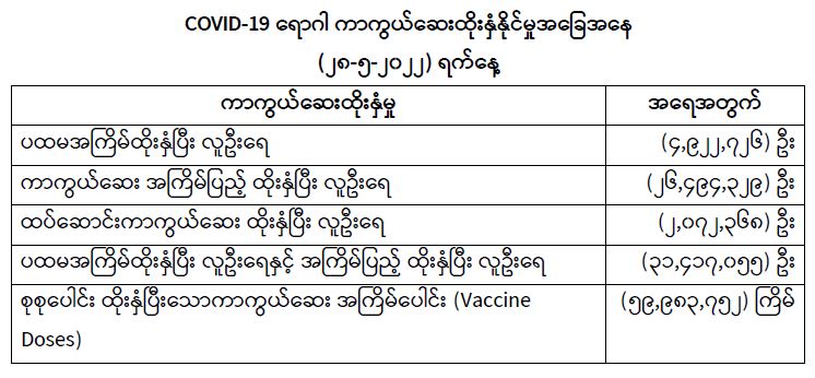 COVID-19 ရောဂါ ကာကွယ်ထိန်းချုပ်ရေးအတွက် တိုင်းဒေသကြီး/ပြည်နယ်များတွင် COVID-19 ရောဂါကာကွယ်ဆေးကို ဦးတည်အုပ်စုများ သတ်မှတ်၍ ထိုးနှံပေးလျက်ရှိရာ (၂၈-၅-၂၀၂၂) ရက်နေ့ အထိ လူဦးရေစုစုပေါင်း (31,417,055) ဦးအား ထိုးနှံပေးပြီးဖြစ်၍ ပထမအကြိမ် ထိုးနှံပြီးစီးသူ (4,922,726) ဦး၊ ကာကွယ်ဆေးအကြိမ်ပြည့်ထိုးနှံပြီးစီးသူ (26,494,329) ဦးနှင့် ထပ်ဆောင်းကာကွယ်ဆေး ထိုးနှံပြီးစီးသူ (2,072,368) ဦး ရှိပြီဖြစ်ပါသည်။ သို့ဖြစ်ပါ၍ (၂၈-၅-၂၀၂၂) ရက်နေ့အထိ မြန်မာနိုင်ငံတွင် COVID-19 ရောဂါကာကွယ်ဆေး အကြိမ်ရေစုစုပေါင်း (59,983,752) ကြိမ် ထိုးနှံပြီးဖြစ်ပါသည်။