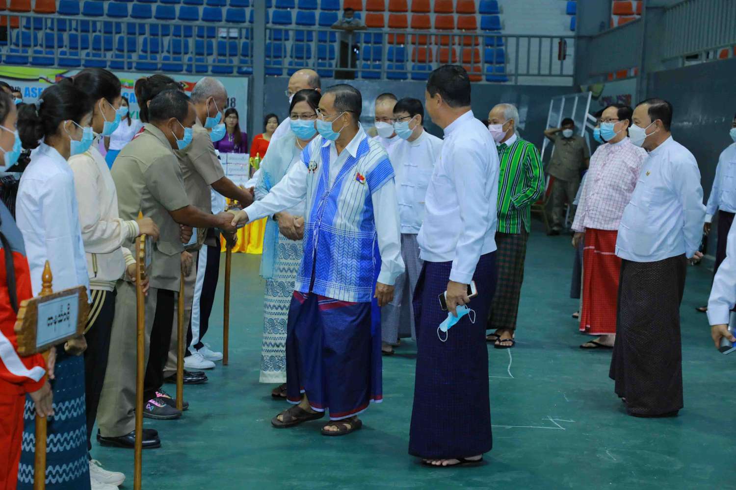 ယင်းနောက် ပြိုင်ပွဲဝင်အားကစားသမားများက အားကစားသစ္စာအဓိဌာန်ရွတ်ဆို၍ နိုင်ငံတော်စီမံအုပ်ချုပ်ရေးကောင်စီဝင်များနှင့် ပြည်ထောင်စုဝန်ကြီးတို့က ပြိုင်ပွဲဝင်အားကစားသမားများကို လိုက်လံနှုတ်ဆက်သည်။