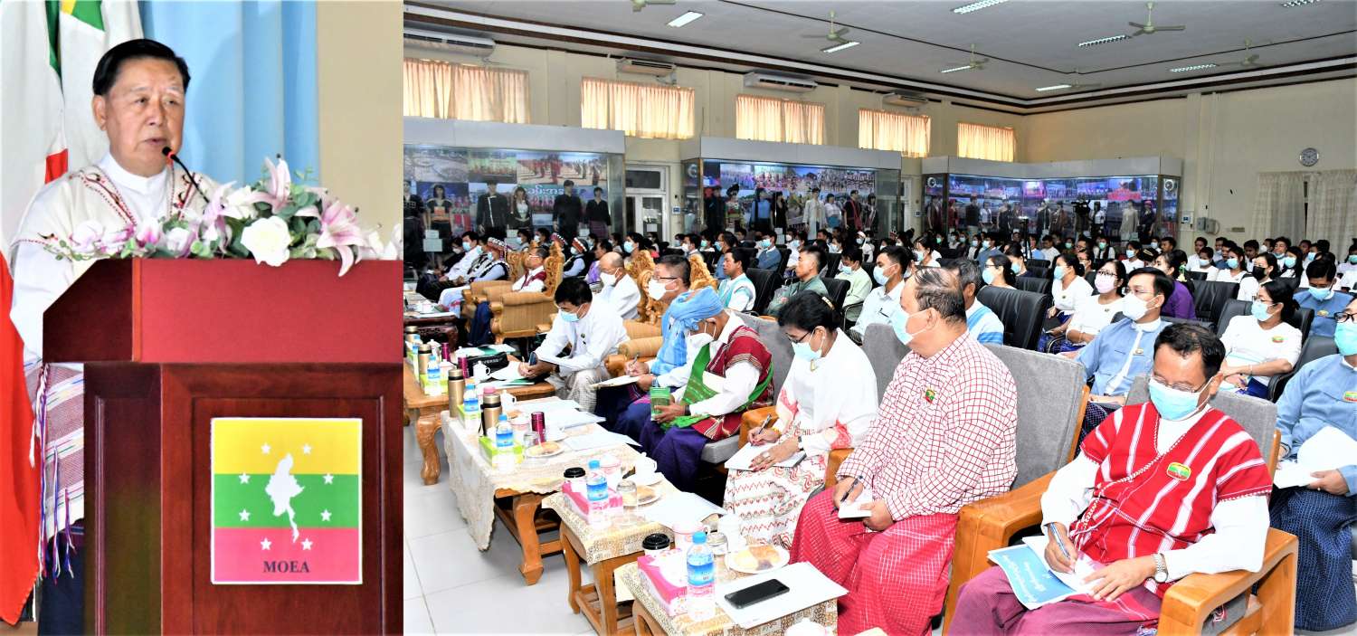 ယင်းနောက် နိုင်ငံတော်စီမံအုပ်ချုပ်ရေးကောင်စီအဖွဲ့ဝင် မန်းငြိမ်းမောင်က တိုင်းပြည်တစ်ခုတွင် တိုင်းရင်းသားစည်းလုံးညီညွတ်ရေးသည် အရေးကြီးပါကြောင်း၊ တိုင်းရင်းသားစည်းလုံး ညီညွတ်ရေးပြိုကွဲပါက ငြိမ်းချမ်းရေး တည်ဆောက်၍ မရနိုင်ပါကြောင်း၊ ခေတ်အဆက်ဆက် နိုင်ငံတော်အစိုးရများက ငြိမ်းချမ်းရေးအတွက် ကြိုးပမ်းခဲ့ကြပါကြောင်း၊ ပဋိပက္ခဖြစ်ပါက အထူးသဖြင့် အမျိုးသမီး၊ ကလေးသူငယ်၊ သက်ကြီးရွယ်အိုများ ပိုမိုခံစားရပါကြောင်း၊ ၂၀၁၅ ခုနှစ် အောက်တိုဘာ ၁၅ ရက်တွင် တစ်နိုင်ငံလုံးအပစ်အခတ်ရပ်စဲရေး သဘောတူစာချုပ်ကို တိုင်းရင်းသား လက်နက်ကိုင်အဖွဲ့အစည်း (၈)ဖွဲ့နှင့် လက်မှတ်ရေးထိုးနိုင်ခဲ့ပါကြောင်း၊ ယခုကာလတွင်လည်း နိုင်ငံတော်စီမံအုပ်ချုပ်ရေးကောင်စီ ဥက္ကဋ္ဌက ငြိမ်းချမ်းရေး တွေ့ဆုံဆွေးနွေးမှုကို ကမ်းလှမ်းထားပါကြောင်း၊ အမျိုးသားရေးပြဿနာ၊ နိုင်ငံရေးပြဿနာများကို နိုင်ငံရေး စားပွဲပေါ်၌သာ နှစ်ဦးနှစ်ဖက် ပွင့်လင်းစွာ ဆွေးနွေးညှိနှိုင်းရန် လိုအပ်ပါကြောင်း၊ တိုင်းရင်းသားများ၏ဘဝကို နားအလည်ဆုံးသောသူမှာ တပ်မတော်သာဖြစ်ပြီး တပ်မတော်ကို နားလည်သူမှာ တိုင်းရင်းသားများဖြစ်ပါကြောင်း၊ တိုင်းပြည်၏ ငြိမ်းချမ်းရေးသည် အသက်တမျှ အရေးကြီးပါကြောင်း၊ ဝန်ထမ်းများအနေဖြင့် ဝန်ကြီးဌာန၏အရေးပါမှုကို ဂုဏ်ယူရမည်ဖြစ်ပြီး တိုင်းရင်းသား စည်းလုံးညီညွတ်ရေးအတွက် တစ်ထောင့်တစ်နေရာမှ ပါဝင်ဆောင်ရွက်ကြစေလို ပါကြောင်း ဆွေးနွေးပြောကြားသည်။