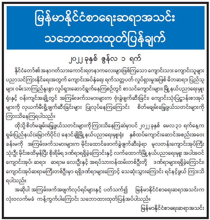 မြန်မာနိုင်ငံစာရေးဆရာအသင်း သဘောထားထုတ်ပြန်ချက်