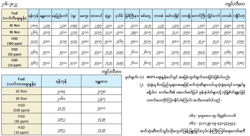 ရန်ကုန်မြို့နှင့် မန္တလေးမြို့အတွက် ရည်ညွှန်းလက်ကားဈေးနှုန်းများနှင့် ပြည်ထောင်စုနယ်မြေ နေပြည်တော်၊ တိုင်းဒေသကြီး/ပြည်နယ် မြို့တော်များအတွက် ရည်ညွှန်းလက်လီဈေးနှုန်းများ 06/02/2022