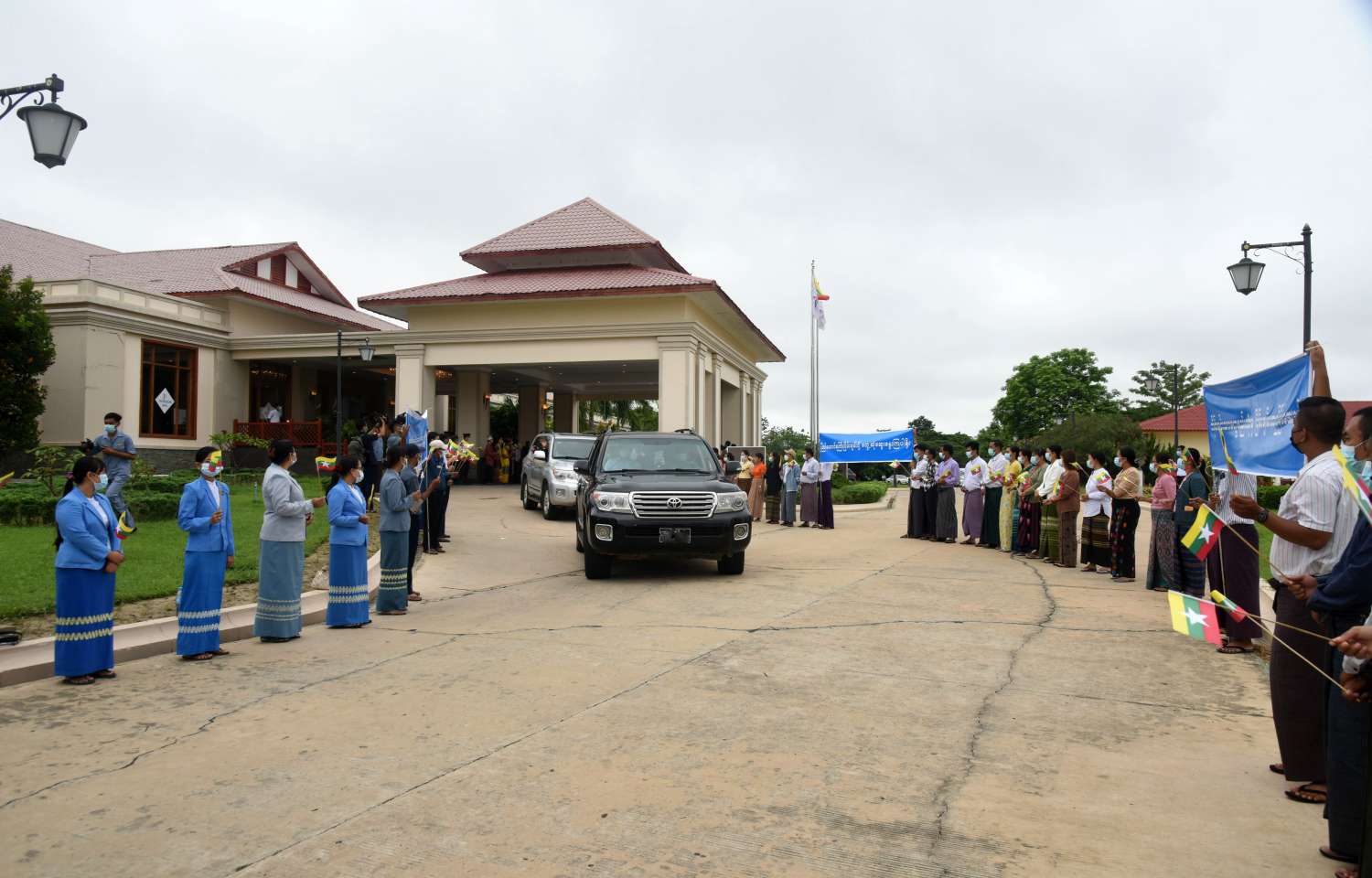 “ဝ” ပြည် သွေးစည်းညီညွတ်ရေးပါတီ ဒုတိယဥက္ကဋ္ဌ၊ ဆွေးနွေးရေးအဖွဲ့ခေါင်းဆောင်ဦးဆောင်သည့် ငြိမ်းချမ်းရေးကိုယ်စားလှယ်အဖွဲ့အား အမျိုးသားစည်းလုံးညီညွတ်ရေးနှင့် ငြိမ်းချမ်းရေးဖော်ဆောင်မှုညှိနှိုင်းရေးကော်မတီအဖွဲ့ဝင်နှင့်တာဝန်ရှိသူများ၊သာသနာရေးနှင့်ယဉ်ကျေးမှုဝန်ကြီးဌာန၊ အနုပညာဦးစီးဌာနမှတိုင်းရင်းသားတိုင်းရင်းသူများ၊ ဌာနဆိုင်ရာဝန်ထမ်းများ၊ ငြိမ်းချမ်းရေးကိုလိုလားသည့် ဒေသခံပြည်သူများက ထာဝရငြိမ်းချမ်းရေးရရှိရေးသည် ပြည်သူတစ်ရပ်လုံး၏ ဆန္ဒအစစ်အမှန်ဖြစ်သည်၊ ငြိမ်းချမ်းရေးရရှိရေးသည် နိုင်ငံသား အားလုံး၏ဆန္ဒအမှန်ဖြစ်သည်၊ ပြည်ထောင်စုကြီးငြိမ်းချမ်းဖို့ တွေ့ဆုံဆွေးနွေးကြပါစို့၊ တိုင်းရင်းသားတွေစည်းလုံးမှ ငြိမ်းချမ်းတည်ငြိမ်အေးချမ်းရ စသည့် စာသားပါဆိုင်းဘုတ်များနှင့် နိုင်ငံတော်အလံငယ်များကိုကိုင်ဆောင်၍ နေပြည်တော်ရှိ Horizon Lake View Resort ၌ ပို့ဆောင်နှုတ်ဆက်ကြသည်။