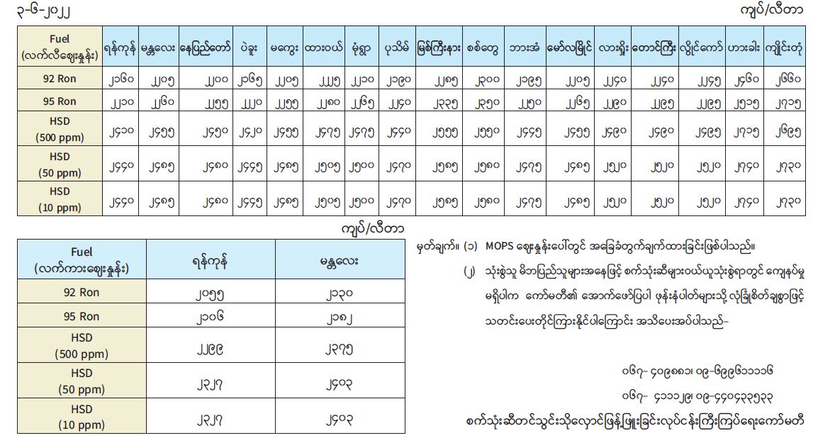 ရန်ကုန်မြို့နှင့် မန္တလေးမြို့အတွက် ရည်ညွှန်းလက်ကားဈေးနှုန်းများနှင့် ပြည်ထောင်စုနယ်မြေ နေပြည်တော်၊ တိုင်းဒေသကြီး/ပြည်နယ် မြို့တော်များအတွက် ရည်ညွှန်းလက်လီဈေးနှုန်းများ
