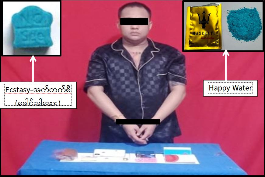 ဖြစ်စဉ်မှာ မူးယစ်ဆေးဝါး တားဆီးနှိမ်နင်းရေးရဲတပ်ဖွဲ့မှ တပ်ဖွဲ့ဝင်များပါဝင်သော ပူးပေါင်း အဖွဲ့သည် မေ ၂၅ ရက် မွန်းလွဲ ၂ နာရီခွဲတွင် ရန်ကုန်တိုင်းဒေသကြီး၊ ဗဟန်းမြို့နယ်၊ ဆရာစံရပ်ကွက်ရှိ ဟိုတယ်အခန်းအမှတ်(၅၀၉)ကို သတင်းအရရှာဖွေရာ နိုင်လွင်နှင့် ဟိန်းသူစိုး(ခ) Shake တို့ ၂ ဦးအား Ecstasy-အက်တက်စီ(ခေါင်းခါဆေး)ဆေးပြား ၅၀ ၊ Ketamine-ကက်တမင်း ၃ ဂရမ်နှင့်အတူ ဖမ်းဆီးရမိခဲ့ပြီး စစ်ဆေးချက်အရ ည ၇ နာရီတွင် စိတ်ပြောင်းဆေးဝါးများ ဖြန့်ဖြူးရောင်းချသူ ထက်အောင်ဝေ(ခ)Jason ကို ရန်ကင်းမြို့နယ်၊ အမှတ်(၅)ရပ်ကွက်ရှိ ဟိုတယ်ကားပါကင်၌ Chevrolet မော်တော်ယာဉ်နှင့်အတူ Ecstasy-အက်တက်စီ(ခေါင်းခါဆေး)ဆေးပြား ၄,၀၀၀ ၊ Ketamine-ကက်တမင်း ဂရမ် ၁၇၀ ၊ Happy Water (စိတ်ပြောင်းဆေးဝါးများ ရောစပ်ထားသောအမှုန့်) ၇ ဂရမ်စီပါ အထုပ် ၇၀ နှင့်အတူ ဆက်လက်ဖမ်းဆီးရမိခဲ့ကြောင်း၊ သတင်းကွင်းဆက်အရ မေ ၂၆ ရက် နံနက် ၇ နာရီတွင် ကရင်ပြည်နယ်၊ မြဝတီမြို့၊ အမှတ်(၄)ရပ်ကွက်ရှိ စားသောက်ဆိုင် ပိုင်ရှင် ကောင်းစစ်(ခ) ကိုစစ် ကို Ketamine-ကက်တမင်း သုည ဒသမ ၂ ဂရမ်၊ Ecstasy-အက်တက်စီ (ခေါင်းခါဆေး) ဆေးပြား ၁ ပြား၊ Happy Water (စိတ်ပြောင်းဆေးဝါးများရောစပ်ထားသော အမှုန့်) ၁၅ ဂရမ်တို့နှင့်အတူ ဖမ်းဆီးရမိခဲ့သဖြင့် စုစုပေါင်း ဒေသကာလတန်ဖိုးတန်ဖိုး ငွေကျပ်သိန်း ၁,၇၀၀ ကျော် တန်ဖိုးရှိ Ecstasy-အက်တက်စီ(ခေါင်းခါဆေး)ဆေးပြား ၄,၀၅၁ ပြား၊ Ketamine-ကက်တမင်း ၁၇၃ ဒသမ ၂ ဂရမ်၊ Happy Water (စိတ်ပြောင်း ဆေးဝါးများ ရောစပ်ထားသောအမှုန့်) ၄၉၇ ဂရမ်တို့ ဖမ်းဆီးရမိခဲ့ကြောင်း၊ စစ်ဆေး ဖော်ထုတ်ချက်အရ သိမ်းဆည်းရမိ စိတ်ပြောင်းဆေးဝါးများဖြစ်သည့် Ecstasy-အက်တက်စီ(ခေါင်းခါဆေး) ၁ ပြားလျှင် ငွေကျပ် ၆ သောင်း၊ Ketamine-ကက်တမင်း ၁ ဂရမ်လျှင် ငွေကျပ် ၆ သောင်း၊ Happy Water(စိတ်ပြောင်းဆေးဝါးများရောစပ်ထား သောအမှုန့်) ၇ ဂရမ်ပါ ၁ ထုပ်လျှင် ငွေကျပ် ၈ သောင်းနှုန်းဖြင့် KTV နှင့် Entertainment/ Bar/ Club များတွင် လာရောက်ကြသည့် လူငယ်များကို ဖြန့်ဖြူးရောင်းချခြင်းဖြစ်ကြောင်း သိရှိရသဖြင့် ၎င်းတို့အား ဥပဒေအရ အရေးယူထားရှိပြီး ကွင်းဆက်ပြစ်မှု ကျူးလွန်သူများနှင့် အလားတူ လူငယ်များအန္တရာယ် ဖြစ်စေနိုင်သည့် မူးယစ်ဆေးဝါးနှင့် စိတ်ကိုပြောင်းလဲစေသောဆေးဝါးများ ဖြန့်ဖြူးရောင်းချမှုများကို ဆက်လက်စစ်ဆေး ဖော်ထုတ်လျက်ရှိကြောင်း သိရသည်။