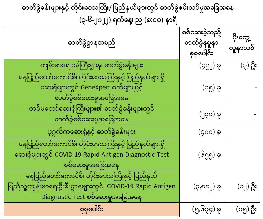 COVID-19 သံသယလူနာများ၊ ဓာတ်ခွဲအတည်ပြုလူနာနှင့် အနီးကပ်ထိတွေ့ခဲ့သူများနှင့် အသွားအလာ ကန့်သတ်ထားရှိသူများအား COVID-19 ရောဂါ ရှိ၊ မရှိ ဓာတ်ခွဲစမ်းသပ်စစ်ဆေးခြင်းအား ပုံမှန်ဆောင်ရွက်လျက်ရှိပြီး (၂-၆-၂၀၂၂) ရက်နေ့၊ ည (၈:၀၀) နာရီမှ (၃-၆-၂၀၂၂) ရက်နေ့၊ ည (၈:၀၀) နာရီအတွင်း ဓာတ်ခွဲနမူနာစုစုပေါင်း (၅,၆၃၄) ခုအား စစ်ဆေးပြီးစီးခဲ့ရာ COVID-19 ရောဂါ ဓာတ်ခွဲ အတည်ပြုလူနာသစ် (၁၅) ဦး တွေ့ရှိရပါသည်။ ထို့ကြောင့် ယနေ့အတွက် ရောဂါပိုးတွေ့ရှိမှု ရာခိုင်နှုန်းမှာ (၀.၂၇) ရာခိုင်နှုန်း ရှိပါသည်။