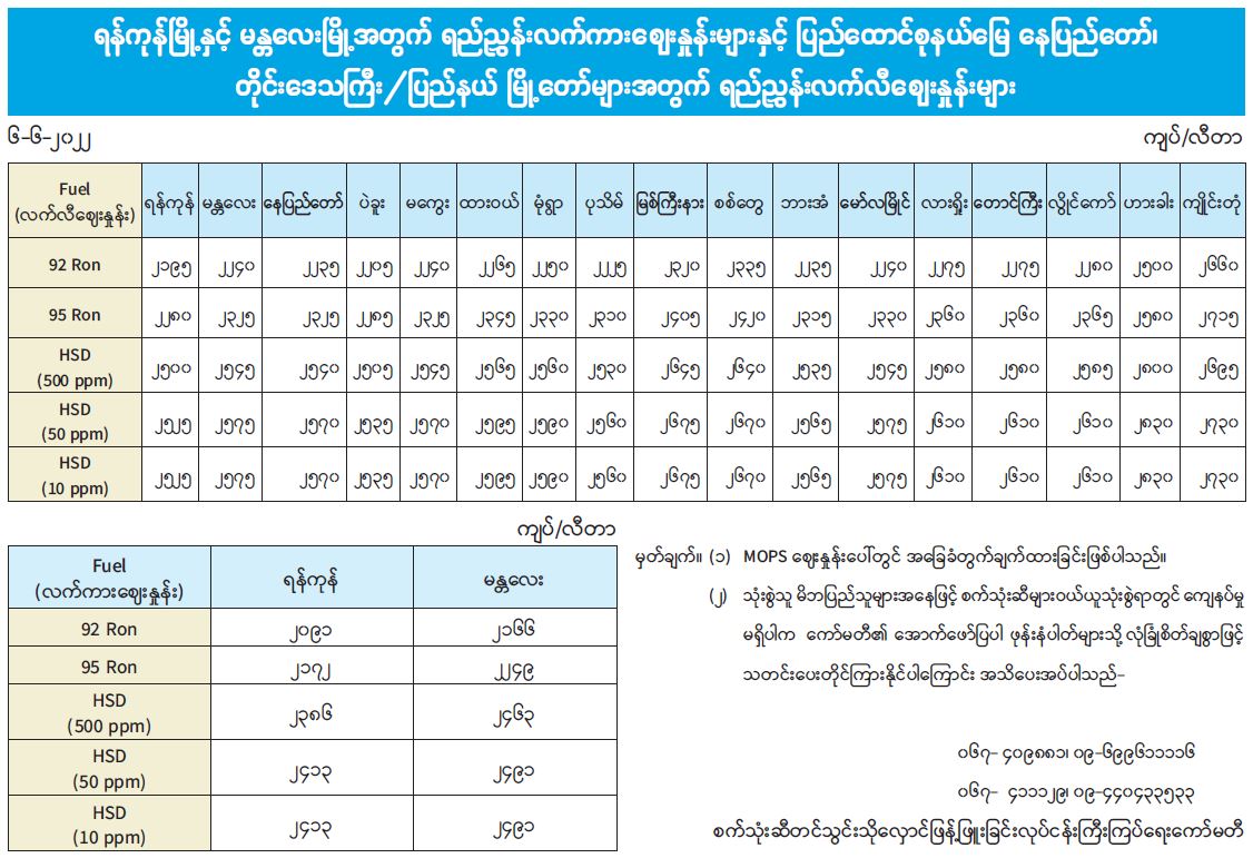 ရန်ကုန်မြို့နှင့် မန္တလေးမြို့အတွက် ရည်ညွှန်းလက်ကားဈေးနှုန်းများနှင့် ပြည်ထောင်စုနယ်မြေ နေပြည်တော်၊ တိုင်းဒေသကြီး/ပြည်နယ် မြို့တော်များအတွက် ရည်ညွှန်းလက်လီဈေးနှုန်းများ 06/06/2022