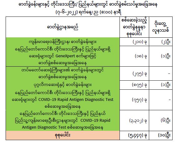 COVID-19 သံသယလူနာများ၊ ဓာတ်ခွဲအတည်ပြုလူနာနှင့် အနီးကပ်ထိတွေ့ခဲ့သူများနှင့် အသွားအလာကန့်သတ်ထားရှိသူများအား COVID-19 ရောဂါ ရှိ၊ မရှိ ဓာတ်ခွဲစမ်းသပ်စစ်ဆေးခြင်းအား ပုံမှန်ဆောင်ရွက်လျက်ရှိပြီး (၆-၆-၂၀၂၂) ရက်နေ့၊ ည (၈:၀၀) နာရီမှ (၇-၆-၂၀၂၂) ရက်နေ့၊ ည (၈:၀၀) နာရီအတွင်း ဓာတ်ခွဲနမူနာစုစုပေါင်း (၅,၄၄၇) ခုအား စစ်ဆေးပြီးစီးခဲ့ရာ COVID-19 ရောဂါ ဓာတ်ခွဲအတည်ပြုလူနာသစ် (၁၀) ဦး တွေ့ရှိရပါသည်။ ထို့ကြောင့် ယနေ့အတွက် ရောဂါပိုးတွေ့ရှိမှု ရာခိုင်နှုန်းမှာ (၀.၁၈) ရာခိုင်နှုန်း ရှိပါသည်။