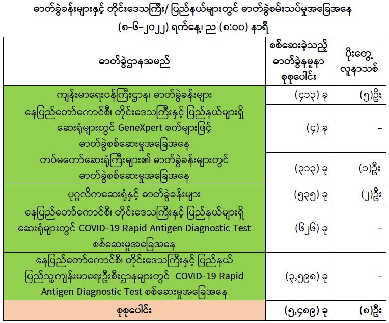 COVID-19 သံသယလူနာများ၊ ဓာတ်ခွဲအတည်ပြုလူနာနှင့် အနီးကပ်ထိတွေ့ခဲ့သူများနှင့် အသွားအလာကန့်သတ်ထားရှိသူများအား COVID-19 ရောဂါ ရှိ၊ မရှိ ဓာတ်ခွဲစမ်းသပ် စစ်ဆေးခြင်းအား ပုံမှန်ဆောင်ရွက်လျက်ရှိပြီး (၇-၆-၂၀၂၂) ရက်နေ့၊ ည (၈:၀၀) နာရီမှ (၈-၆-၂၀၂၂) ရက်နေ့၊ ည (၈:၀၀) နာရီအတွင်း ဓာတ်ခွဲနမူနာစုစုပေါင်း (၅,၄၈၉) ခုအား စစ်ဆေးပြီးစီးခဲ့ရာ COVID-19 ရောဂါဓာတ်ခွဲအတည်ပြုလူနာသစ် (၈) ဦး တွေ့ရှိရပါသည်။ ထို့ကြောင့် ယနေ့အတွက် ရောဂါပိုး တွေ့ရှိမှု ရာခိုင်နှုန်းမှာ (၀.၁၅) ရာခိုင်နှုန်း ရှိပါသည်။