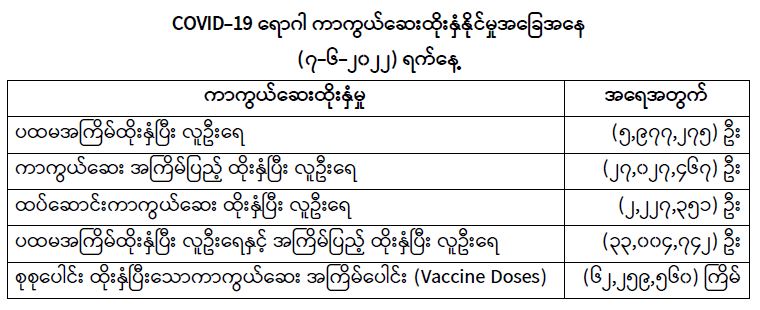COVID-19 ရောဂါ ကာကွယ်ထိန်းချုပ်ရေးအတွက် တိုင်းဒေသကြီး/ပြည်နယ်များတွင် COVID-19 ရောဂါကာကွယ်ဆေးကို ဦးတည်အုပ်စုများသတ်မှတ်၍ ထိုးနှံပေးလျက်ရှိရာ (၇-၆-၂၀၂၂) ရက်နေ့ အထိ လူဦးရေစုစုပေါင်း (၃၃,၀၀၄,၇၄၂) ဦးအား ထိုးနှံပေးပြီးဖြစ်၍ ပထမအကြိမ် ထိုးနှံပြီးစီးသူ (၅,၉၇၇,၂၇၅) ဦး၊ ကာကွယ်ဆေးအကြိမ်ပြည့် ထိုးနှံပြီးစီးသူ (၂၇,၀၂၇,၄၆၇) ဦးနှင့် ထပ်ဆောင်း ကာကွယ်ဆေး ထိုးနှံပြီးစီးသူ (၂,၂၂၇,၃၅၁) ဦး ရှိပြီဖြစ်ပါသည်။ သို့ဖြစ်ပါ၍ (၇-၆-၂၀၂၂) ရက်နေ့ အထိ မြန်မာနိုင်ငံတွင် COVID-19 ရောဂါကာကွယ်ဆေး အကြိမ်ရေ စုစုပေါင်း (၆၂,၂၅၉,၅၆၀) ကြိမ် ထိုးနှံပြီး ဖြစ်ပါသည်။