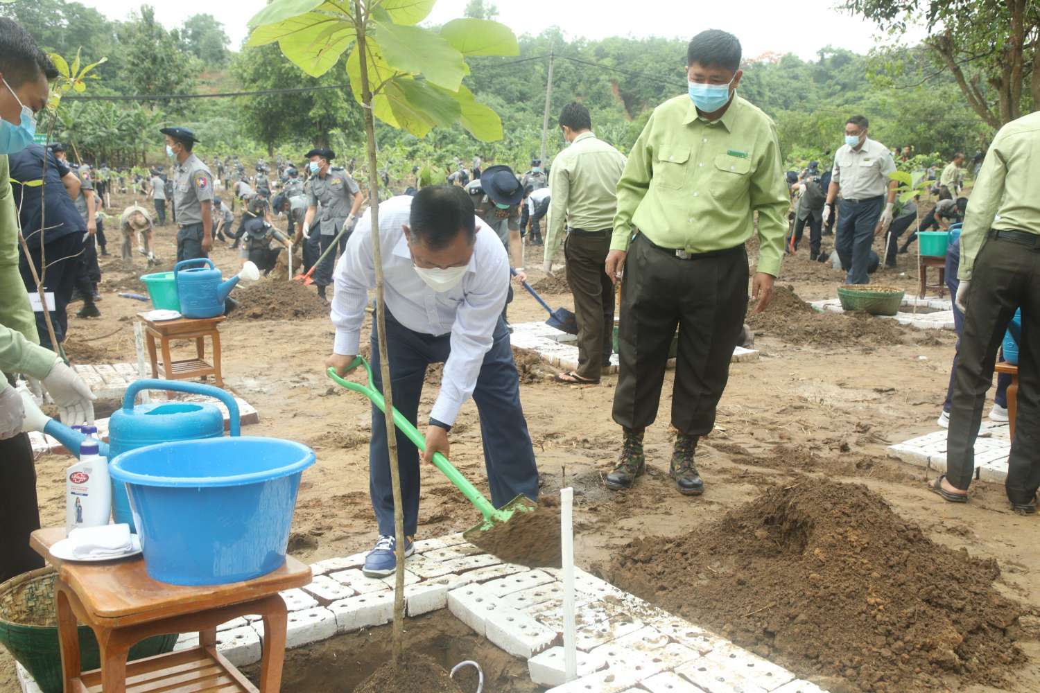ထို့နောက် ပြည်ထောင်စုဝန်ကြီးနှင့်ဇနီးတို့သည် တာဝန်ရှိသူများနှင့်အတူ စုပေါင်းသစ်ပင်စိုက်ပျိုးနေမှုကို လှည့်လည်ကြည့်ရှုအားပေးပြီး မြန်မာနိုင်ငံရဲတပ်ဖွဲ့မှ စိုက်ပျိုးထားသော အောင်မြင်ဖြစ်ထွန်းလျက်ရှိသည့် တစ်ရှူးငှက်ပျောစိုက်ခင်းကို လှည့်လည်ကြည့်ရှုသည်။ ယနေ့ပြုလုပ်သည့် ပြည်ထဲရေးဝန်ကြီးဌာန၊ တပ်ဖွဲ့/ဦးစီးဌာနဝန်ထမ်းများ၏ သစ်ပင်စိုက်ပျိုးပွဲတွင် ရတနာတန်းဝင်ကျွန်းပင်၊ မဟော်ဂနီပင်၊ ပိတောက်ပင်၊ သင်းဝင်ပင်၊ ခရေပင်၊ အရိပ်ရလေကာ မန်ဂျန်ရှားပင်၊ စုစုပေါင်း အပင် ၁၁၂၀ စိုက်ပျိုးခဲ့ကြသည်။ ပြည်ထဲရေးဝန်ကြီးဌာနကွပ်ကဲမှုအောက်ရှိ တပ်ဖွဲ့/ဦးစီးဌာနများ၏ ရုံးချုပ်များနှင့်ဒေသအနှံ့ရုံးဌာန အားလုံးတွင် ယနေ့အထိ ရတနာတန်းဝင်ပင်များ၊ အရိပ်ရလေကာပင်များ၊ သီးပင်စားပင်များ စုစုပေါင်း ၄၂၀၉၉ ပင်ကို စိုက်ပျိုးနိုင်ခဲ့ကြောင်း သိရသည်။