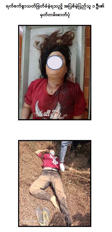 အထက်ပါဖြစ်စဉ်နှင့် ပတ်သက်၍ အပြစ်မဲ့ပြည်သူအမျိုးသမီး ၁ ဦးအား သူလျှို၊ ဒလန်ဟု စွပ်စွဲ၍ အကြိမ်ကြိမ် ညှင်းပန်းနှိပ်စက်ကာ ရက်စက်စွာ သတ်ဖြတ်ခဲ့သည့် လှမျိုးအောင်(ခ)ကိုမျိုး(ခ)ဝက်ကြီး၊ အောင်သူရဇော်(ခ)ကတုံး(ခ)သူရ၊ တင်ထွန်းအောင် (ခ)မိုးလျှံနှင့် မြင့်မြင့်အေးတို့အား စစ်အုပ်ချုပ်ရေး (Martial Law) စစ်ခုံရုံးဖွဲ့၍ စစ်ဆေးမှုများဆောင်ရွက်ခဲ့ပြီး ပြစ်မှုထင်ရှားသဖြင့် ၂၀၂၁ ခုနှစ်၊ ဧပြီလ ၁၂ ရက်တွင် ရာဇသတ်ကြီးပုဒ်မ ၃၀၂ အရ သေဒဏ်ချမှတ်ခဲ့ခြင်းဖြစ်ကြောင်း သတင်းရရှိပါသည်။