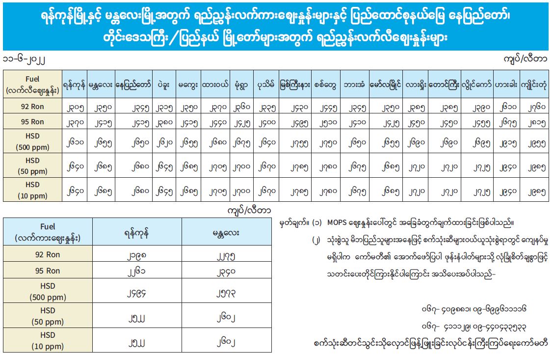 ရန်ကုန်မြို့နှင့် မန္တလေးမြို့အတွက် ရည်ညွှန်းလက်ကားဈေးနှုန်းများနှင့် ပြည်ထောင်စုနယ်မြေ နေပြည်တော်၊ တိုင်းဒေသကြီး/ပြည်နယ် မြို့တော်များအတွက် ရည်ညွှန်းလက်လီဈေးနှုန်းများ 06/11/2022