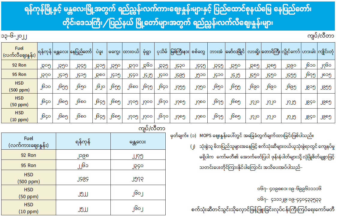 ရန်ကုန်မြို့နှင့် မန္တလေးမြို့အတွက် ရည်ညွှန်းလက်ကားဈေးနှုန်းများနှင့် ပြည်ထောင်စုနယ်မြေ နေပြည်တော်၊ တိုင်းဒေသကြီး/ ပြည်နယ် မြို့တော်များအတွက် ရည်ညွှန်းလက်လီဈေးနှုန်းများ 06/13/2022