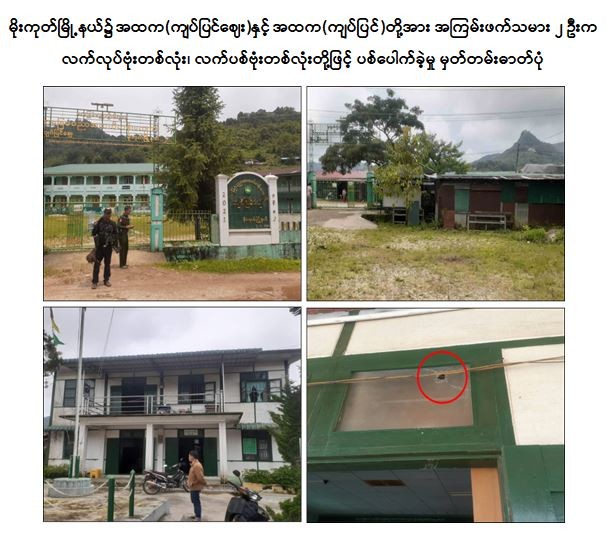 အလားတူ ဇွန်လ ၁၅ ရက် ညနေ ၄ နာရီခွဲအချိန်တွင် ကချင်ပြည်နယ်၊ ရွှေကူမြို့နယ်၊ မြို့ကုန်းကျေးရွာ အခြေခံပညာအထက်တန်း ကျောင်းဝင်းအတွင်း၌ ကျောင်းစောင့်ဖြစ်သူ ဦးမျိုးထွန်းရှိနေစဉ် PDF အမည်ခံအကြမ်းဖက်သမားများရောက်ရှိလာပြီး ဦးမျိုးထွန်းထံမှ ကျောင်းခန်းတံခါးသော့များ ခြိမ်းခြောက်တောင်းယူကာ ကျောင်းဝင်းအတွင်း သိမ်းဆည်းထားရှိသည့် Black Board/White Board ၇ ချပ်၊ စာသင်ခုံသုံးယောက်ထိုင်ခုံအရှည် အစုံ ၅၀ ကျော်ခန့်အား လုယက်ယူဆောင်သွားကြောင်း သိရသည်။