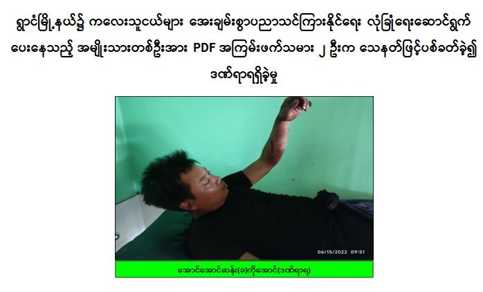 ထိုသို့ဆောင်ရွက်လျက်ရှိရာ ဇွန်လ ၁၅ ရက် နံနက် ၉ နာရီခွဲအချိန်တွင် ရှမ်းပြည်နယ် (တောင်ပိုင်း)၊ ရွာငံမြို့နယ်၊ ကျောက္ကူပြင်ကျေးရွာရှိ အခြေခံပညာအထက်တန်းကျောင်းခွဲ၌ ပညာသင်ကြားလျက်ရှိသည့် ကလေးသူငယ်များ အေးချမ်းစွာပညာသင်ကြားနိုင်ရေးအတွက် လုံခြုံရေးဆောင်ရွက်ပေးနေသည့် ဆင်နက်ချောင်းကျေးရွာနေ ပြည်သူ့စစ်အဖွဲ့ခေါင်းဆောင် ဦးအောင်အောင်ဆန်း (ခ) ကိုအောင်(၃၅)နှစ် (ဘ)ဦးမြစိုးသည် အဆိုပါကျောင်းအရှေ့ရှိ “မင်းထက်သာ” လက်ဖက်ရည်ဆိုင်၌ထိုင်နေစဉ် ဆင်နက်ချောင်းကျေးရွာဘက်မှ ဆိုင်ကယ် မောင်းနှင်လာသည့် PDF အမည်ခံအကြမ်းဖက်သမား မုန့်စီလုံးနှင့်ဒီလုံး (စိစစ်ဆဲ)တို့ ၂ ဦးက ဆိုင်ကယ်တစ်စီးဖြင့်ရောက်ရှိလာပြီး သေနတ်ဖြင့်ပစ်ခတ်ခဲ့ရာ ဦးအောင်အောင်ဆန်း(ခ) ကိုအောင်မှ ဝင်ရောက်လုံးထွေးဖမ်းဆီးခဲ့သော်လည်း အကြမ်းဖက်သမား ၂ ဦး ထွက်ပြေးလွတ်မြောက်သွားခဲ့ပြီး ဦးအောင်အောင်ဆန်း(ခ)ကိုအောင်၏ ဝဲလက်မောင်းနှင့်လက်ဖျံတို့တွင် ကျည်ထိမှန်ဒဏ်ရာ ၂ ချက်ရရှိခဲ့သဖြင့် ဆေးကုသမှုခံယူလျက်ရှိကြောင်း သိရသည်။